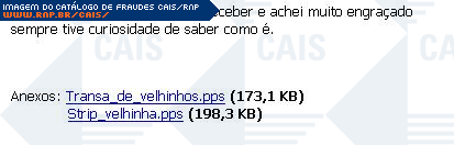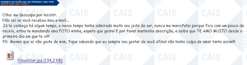 | comentário | Fraude que se passa por uma declaração de amor. O link presente na mensagem faz o download do arquivo malicioso, fotos.pif, que foi identificado por antivirus como Trojan.DownLoader.origin | |