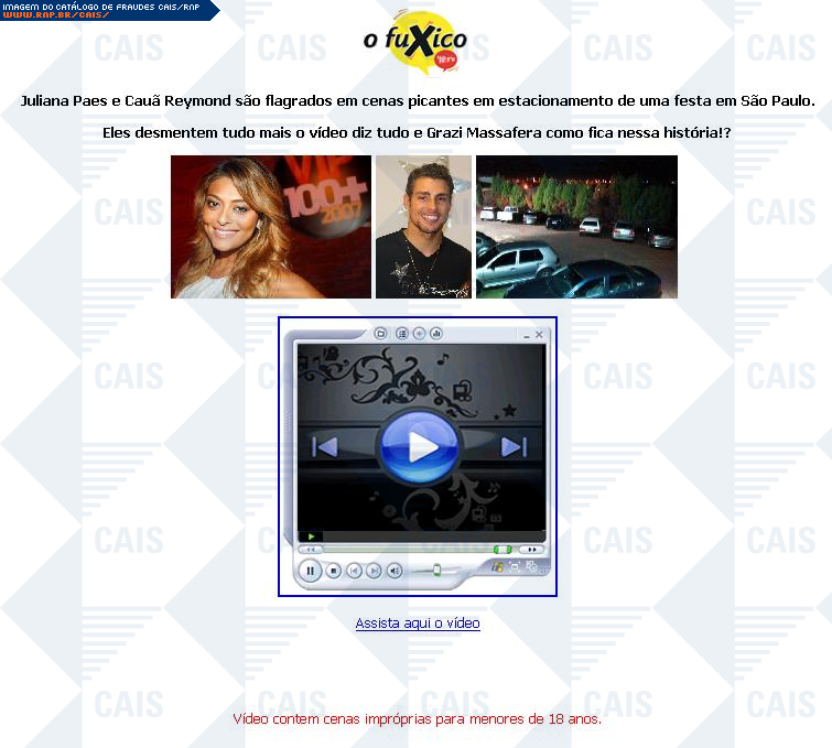 | comentário | Fraude que utiliza o nome do site O Fuxico e das personalidades Juliana Paes e Cauã Reymond. A mensagem possui um link para o arquivo malicioso video.exe. | |