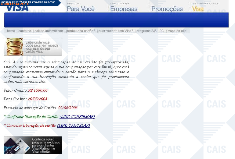| comentário | Fraude que utiliza o nome da operadora de cartão Visa informando sobre a aprovação de um crédito no valor de R$ 1.560,00. O link presente na mensagem faz o download do arquivo Visa.scr que foi identificado por antivirus como Trojan.Downloader.Banload.NVX | |