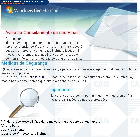 | assunto | Seu Hotmail foi denunciado e poderá ser cancelado. | |
