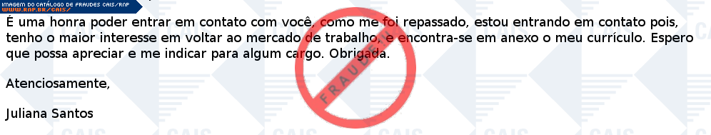 | comentário | O usuário recebe uma mensagem contendo um currículo disponível para download, no entanto o arquivo originado é malicioso criado para roubar informações da vítima e instalar outros arquivos fraudulentos com o nome de Trojan.GenericKD.1903212. | |