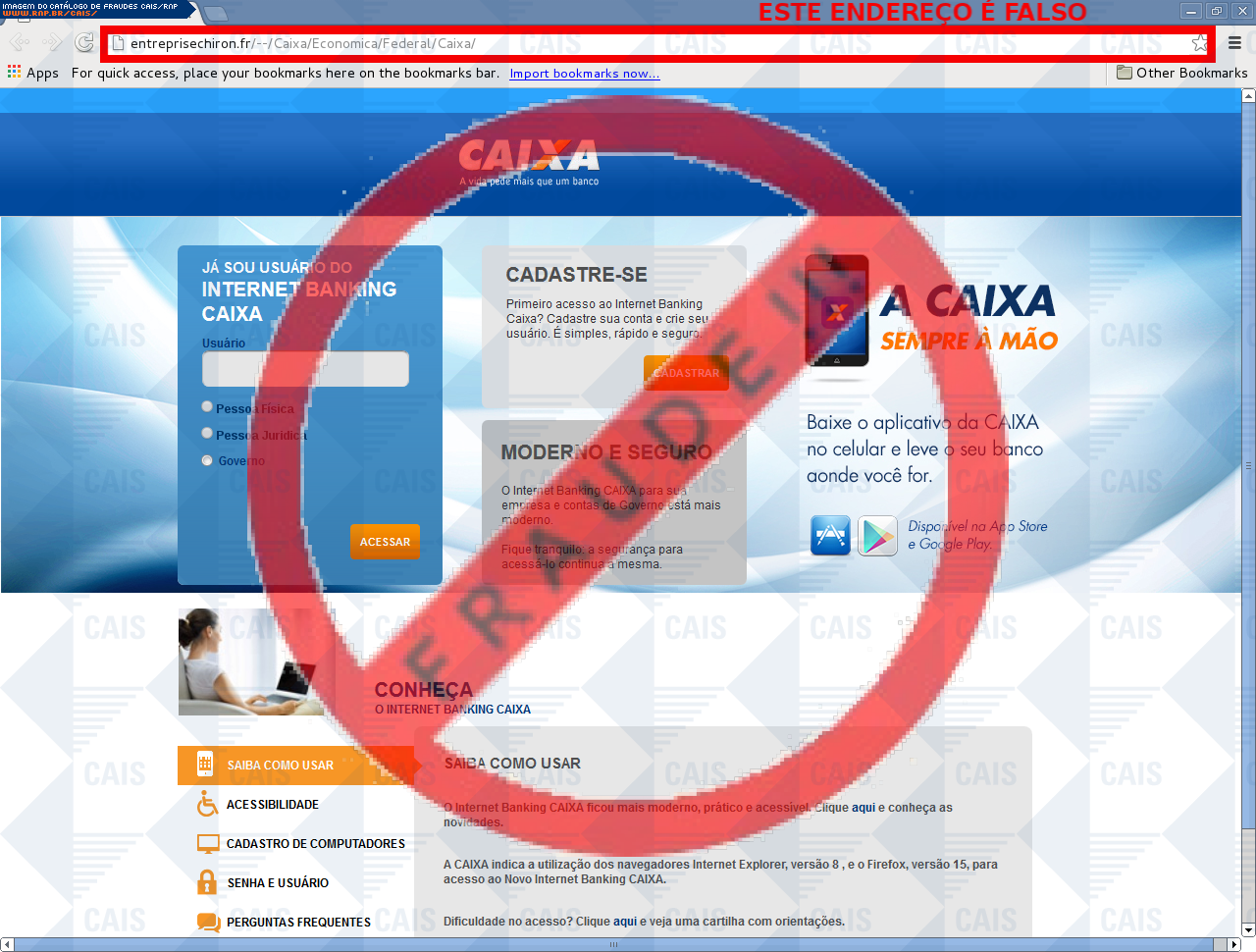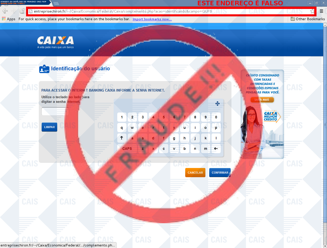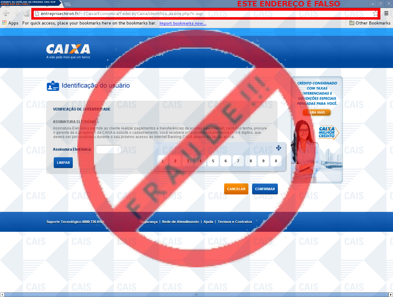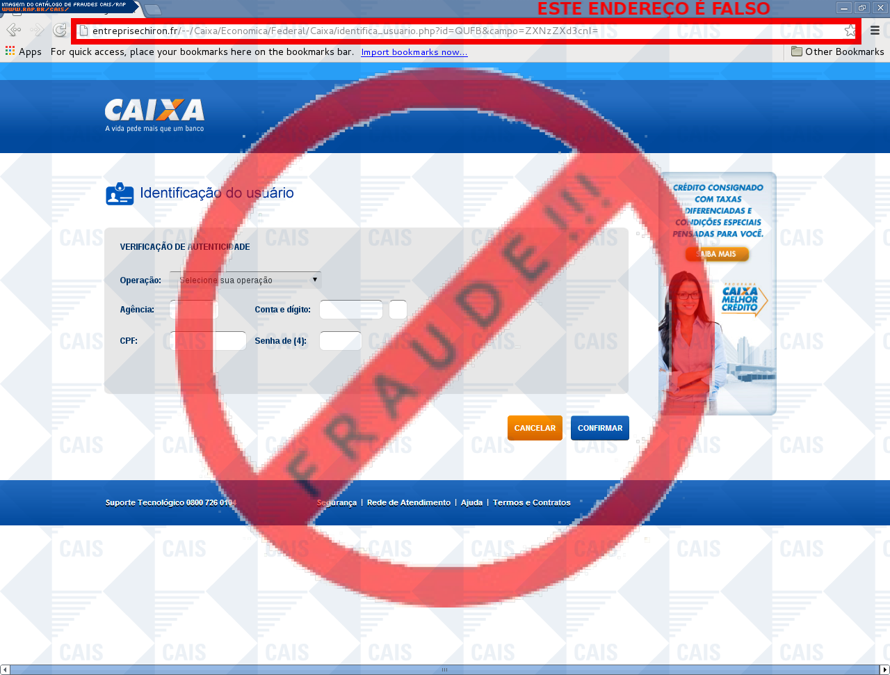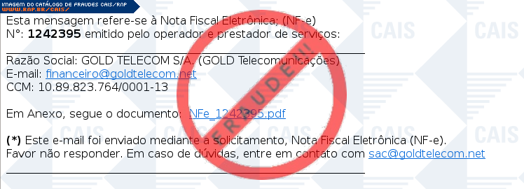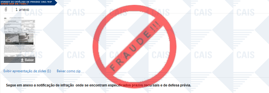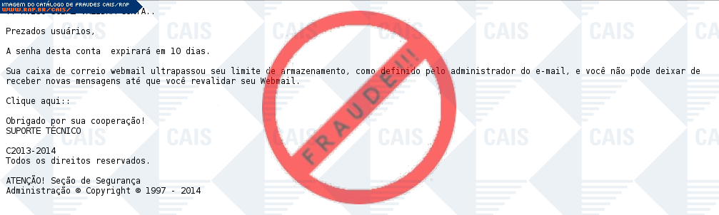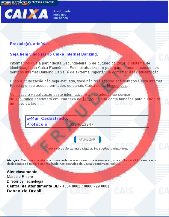 Esta página tem função informativa e educativa. Exibe uma coleção de imagens de phishing scam (fraudes eletrônicas) ou malware (código malicioso) veiculados por meio de spam (e-mail não-solicitado). Trata-se de conteúdo exemplificativo, não exaustivo, uma vez que não é possível contemplar todos os casos de fraudes existentes. Assim, caso você tenha conhecimento de um exemplar que não esteja aqui presente, isto não significa que não seja válido ou real. Inclusive incentivamos que você o envie para análise do CAIS para que, se for o caso, passe a integrar o nosso acervo.