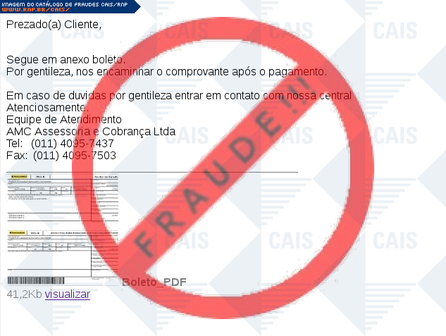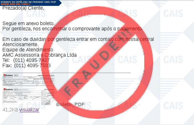 Esta página tem função informativa e educativa. Exibe uma coleção de imagens de phishing scam (fraudes eletrônicas) ou malware (código malicioso) veiculados por meio de spam (e-mail não-solicitado). Trata-se de conteúdo exemplificativo, não exaustivo, uma vez que não é possível contemplar todos os casos de fraudes existentes. Assim, caso você tenha conhecimento de um exemplar que não esteja aqui presente, isto não significa que não seja válido ou real. Inclusive incentivamos que você o envie para análise do CAIS para que, se for o caso, passe a integrar o nosso acervo.