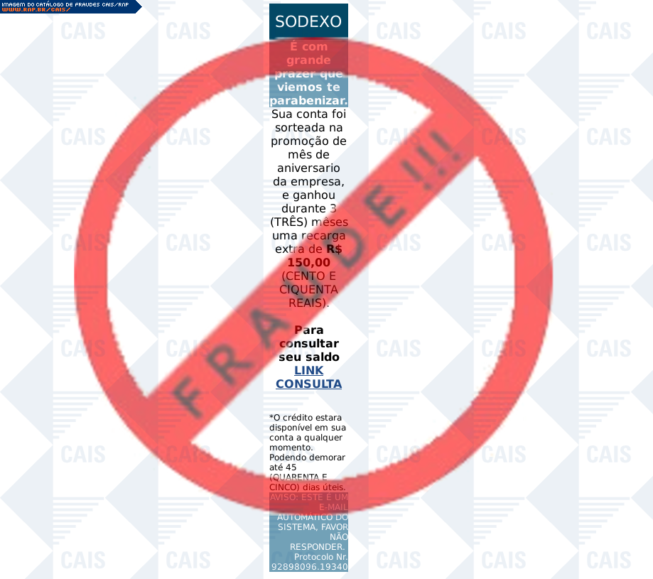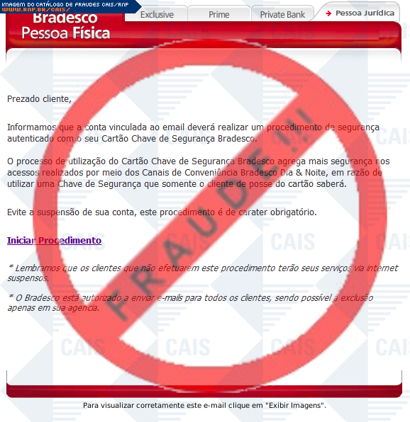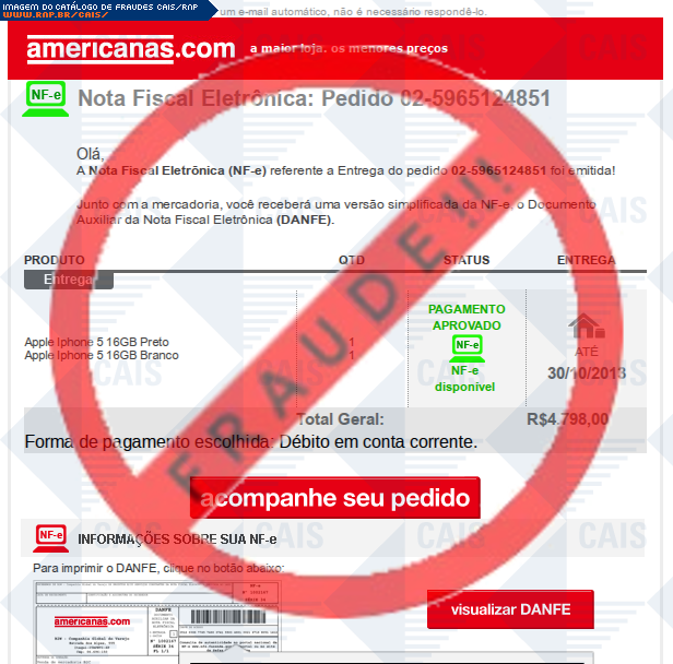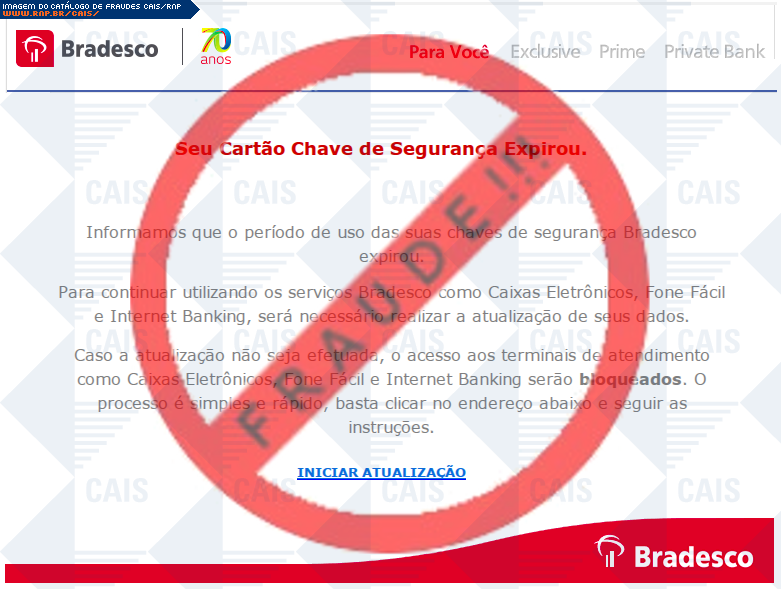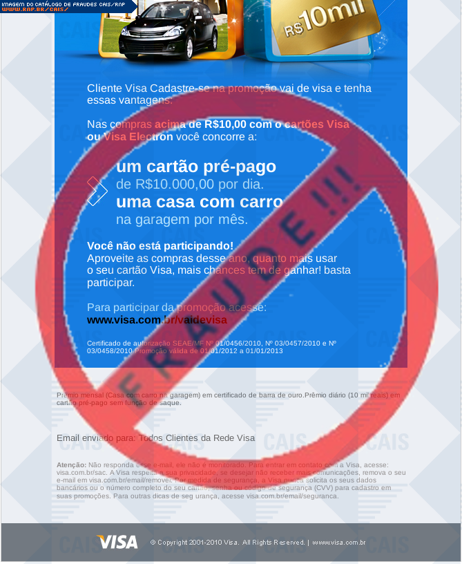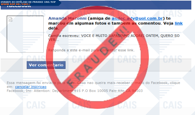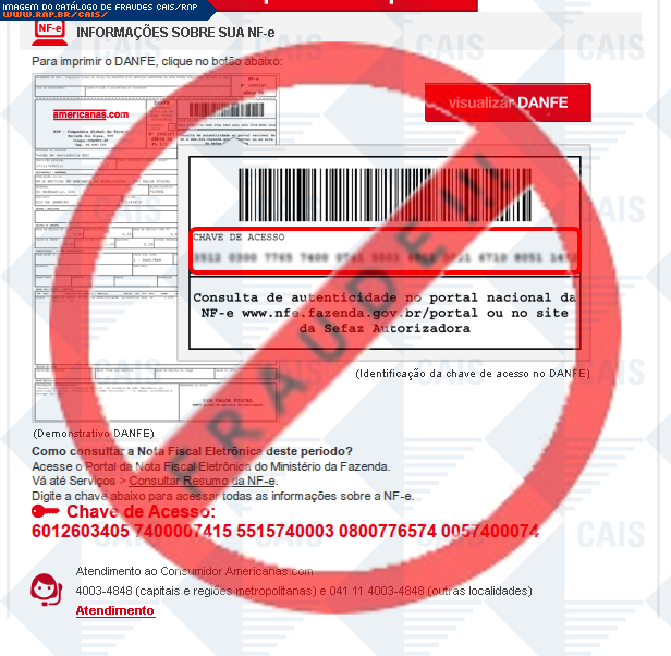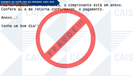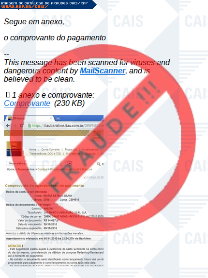 Esta página tem função informativa e educativa. Exibe uma coleção de imagens de phishing scam (fraudes eletrônicas) ou malware (código malicioso) veiculados por meio de spam (e-mail não-solicitado). Trata-se de conteúdo exemplificativo, não exaustivo, uma vez que não é possível contemplar todos os casos de fraudes existentes. Assim, caso você tenha conhecimento de um exemplar que não esteja aqui presente, isto não significa que não seja válido ou real. Inclusive incentivamos que você o envie para análise do CAIS para que, se for o caso, passe a integrar o nosso acervo.