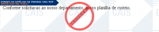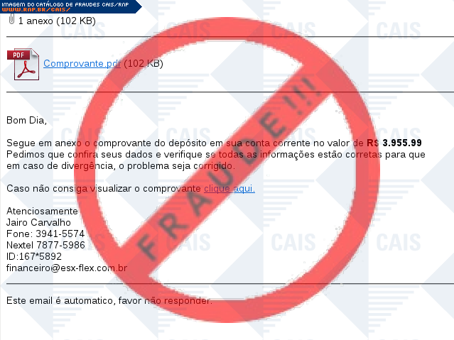 Esta página tem função informativa e educativa. Exibe uma coleção de imagens de phishing scam (fraudes eletrônicas) ou malware (código malicioso) veiculados por meio de spam (e-mail não-solicitado). Trata-se de conteúdo exemplificativo, não exaustivo, uma vez que não é possível contemplar todos os casos de fraudes existentes. Assim, caso você tenha conhecimento de um exemplar que não esteja aqui presente, isto não significa que não seja válido ou real. Inclusive incentivamos que você o envie para análise do CAIS para que, se for o caso, passe a integrar o nosso acervo.
