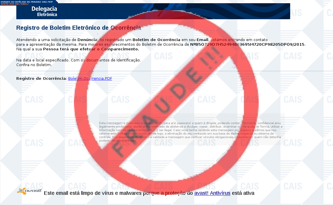 | comentário | O usuário recebe uma mensagem contendo um boletim de ocorrêcias disponível para download, no entanto o arquivo originado é malicioso criado para roubar informações da vítima e instalar outros arquivos fraudulentos com o nome de Packer.Enigma.A. | |