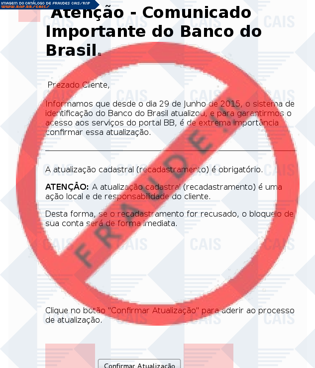 | comentário | O usuário recebe uma mensagem informando que o sistema do Banco do Brasil atualizou sendo necessário realizar uma atualização também na sua conta, no entanto a página é falsa destinada a roubar as informações bancárias do usuário. | |