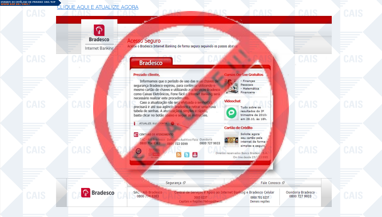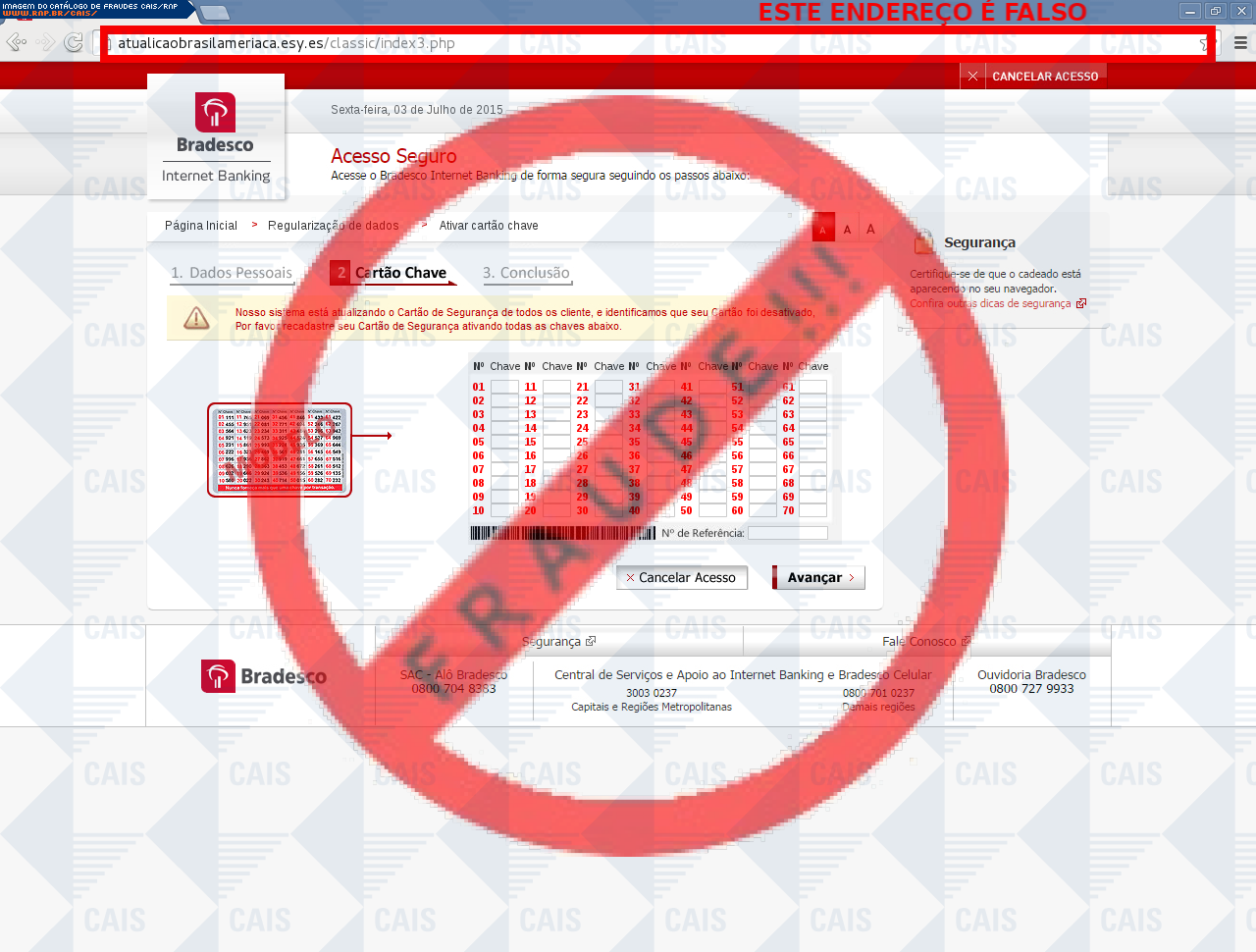 | comentário | O usuário recebe um e-mail informando que o período de uso de sua chave de segurança da conta do banco Bradesco expirou sendo necessário realizar uma atualização no link disponibilizado, entretanto a página fornecida é falsa criada para roubar os dados bancários... (leia mais) | |