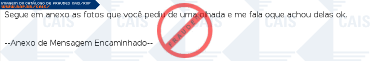 | comentário | O usuário recebe uma mensagem contendo fotos supostamente solicidatas disponível em anexo, no entanto o arquivo originado é malicioso criado para roubar informações da vítima e instalar outros arquivos fraudulentos com o nome de Trojan/Win32.CSon. | |