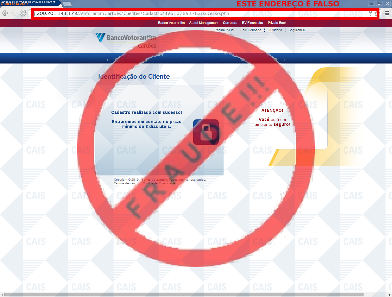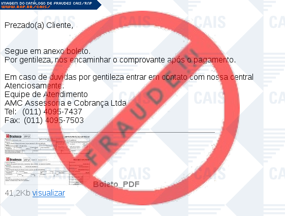 Esta página tem função informativa e educativa. Exibe uma coleção de imagens de phishing scam (fraudes eletrônicas) ou malware (código malicioso) veiculados por meio de spam (e-mail não-solicitado). Trata-se de conteúdo exemplificativo, não exaustivo, uma vez que não é possível contemplar todos os casos de fraudes existentes. Assim, caso você tenha conhecimento de um exemplar que não esteja aqui presente, isto não significa que não seja válido ou real. Inclusive incentivamos que você o envie para análise do CAIS para que, se for o caso, passe a integrar o nosso acervo.