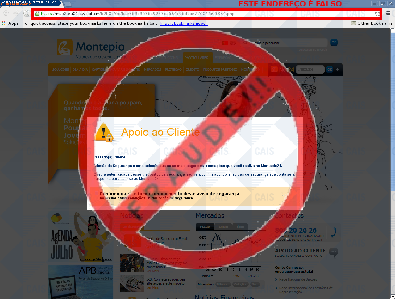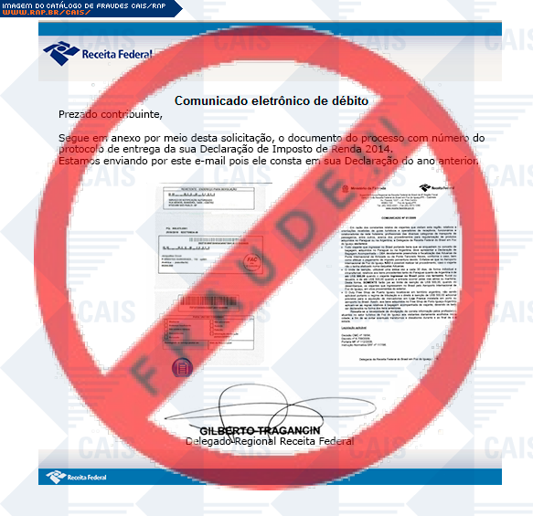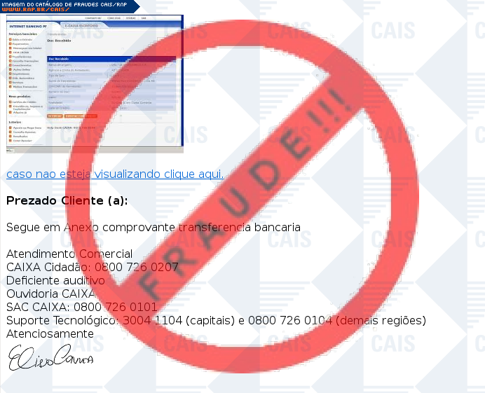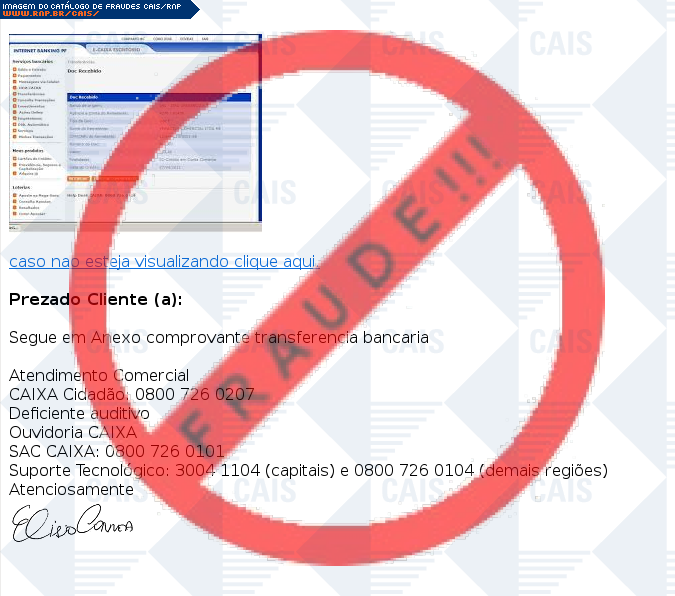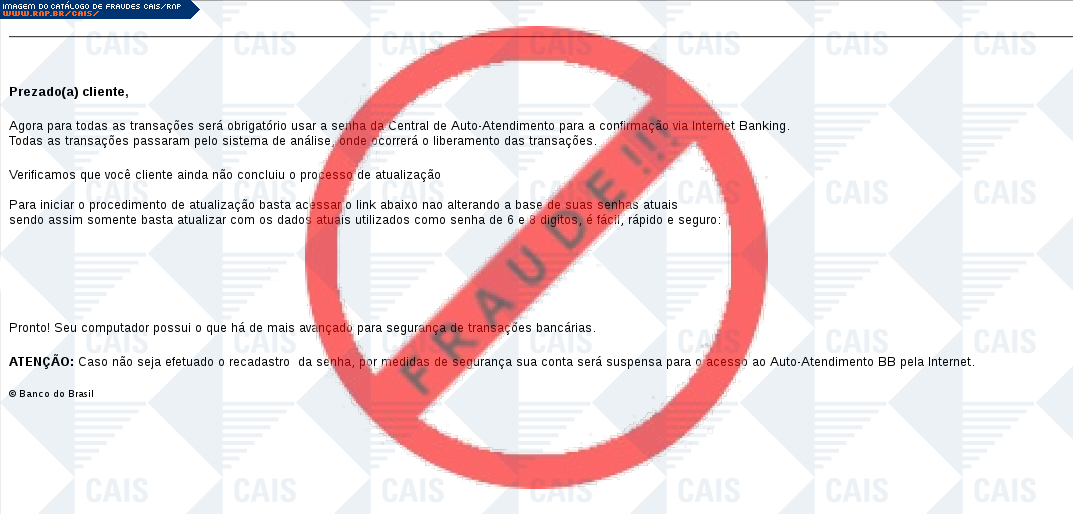 Esta página tem função informativa e educativa. Exibe uma coleção de imagens de phishing scam (fraudes eletrônicas) ou malware (código malicioso) veiculados por meio de spam (e-mail não-solicitado). Trata-se de conteúdo exemplificativo, não exaustivo, uma vez que não é possível contemplar todos os casos de fraudes existentes. Assim, caso você tenha conhecimento de um exemplar que não esteja aqui presente, isto não significa que não seja válido ou real. Inclusive incentivamos que você o envie para análise do CAIS para que, se for o caso, passe a integrar o nosso acervo.
