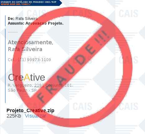 | comentário | O usuário recebe uma mensagem contendo uma proposta de projeto da empresa Criative disponível para download, no entanto o arquivo originado é malicioso criado para roubar informações da vítima e instalar outros arquivos fraudulentos com o nome de Gen:Variant.Symmi.44066.... (leia mais) | |