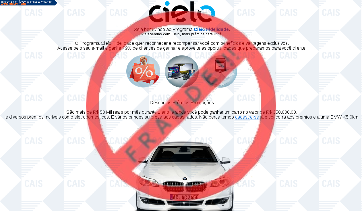 | comentário | A vítima recebe um e-mail informando sobre os benefícios do programa de fidelidade do cartão Cielo disponibilizando o link para cadastro, no entanto a página é falsa criada para roubar as informações do cartão da vítima. | |