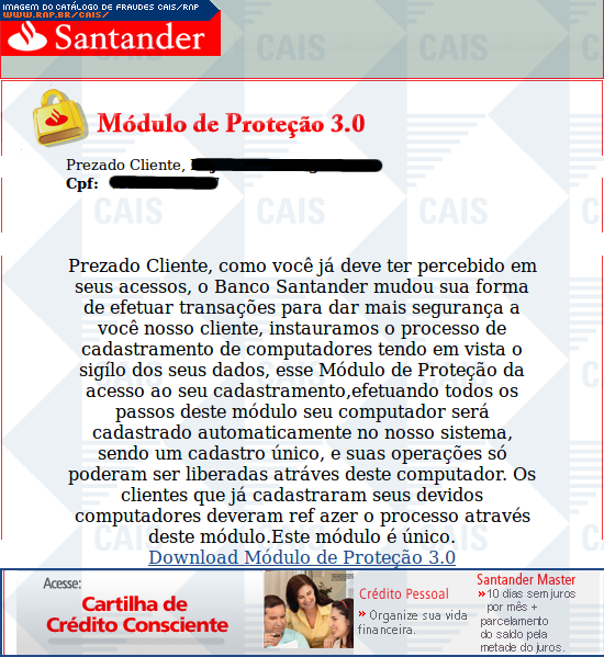 | comentário | A fraude se passa por um comunicado do banco Santander que informa que o módulo de segurança da vítima está desatualizado. O link para a suposta atualização leva ao malware Trojan-Banker.Win32.Banker.bofl (Kaspersky). | |