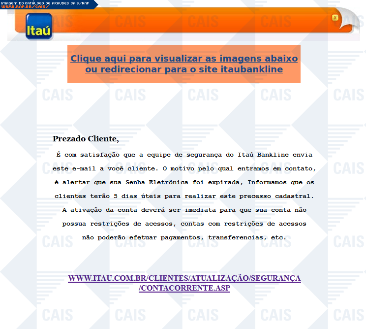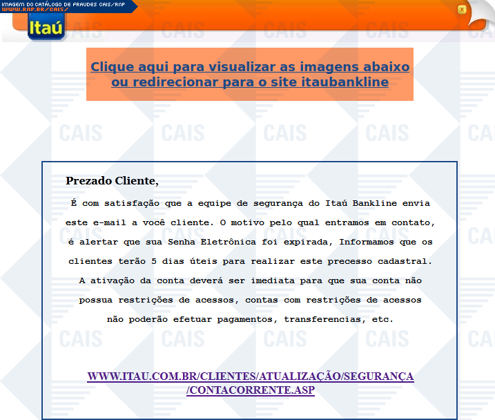 | comentário | Comunicado falso em nome do banco Itaú informando que a senha eletrônica da vítima expirou. A fraude contém um link que leva a uma página falsa que tenta aliciar a vítima a fornecer seus dados pessoais. | |