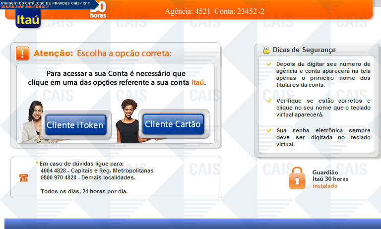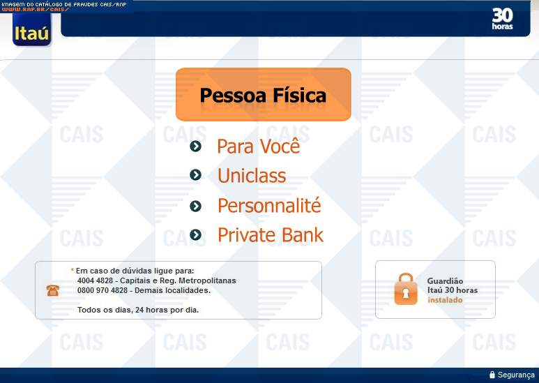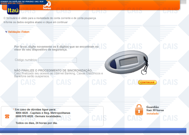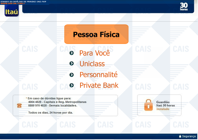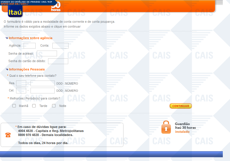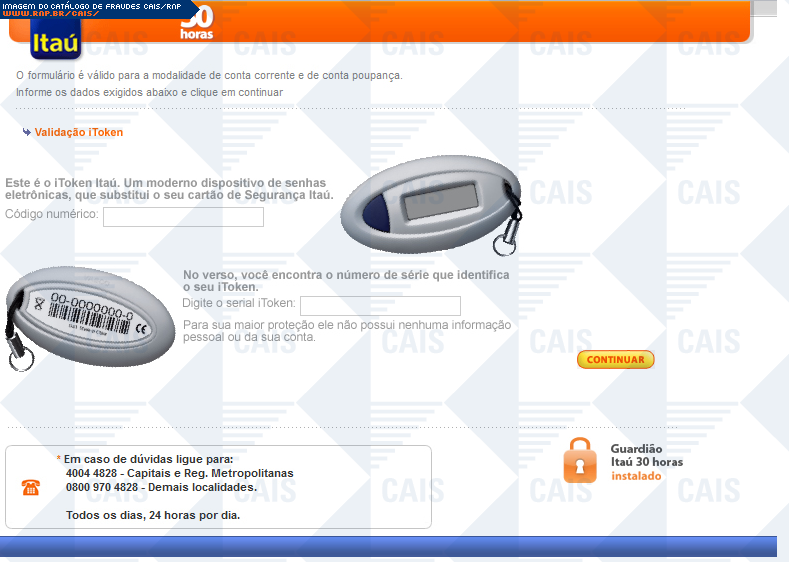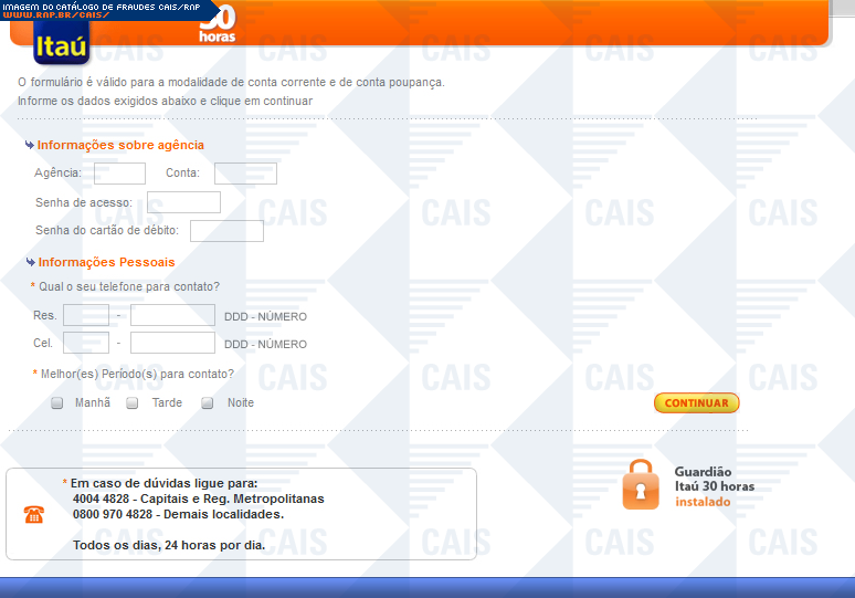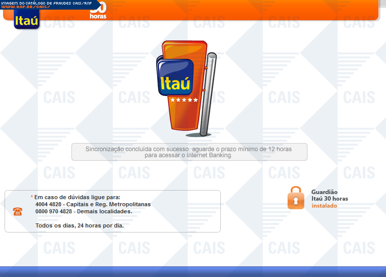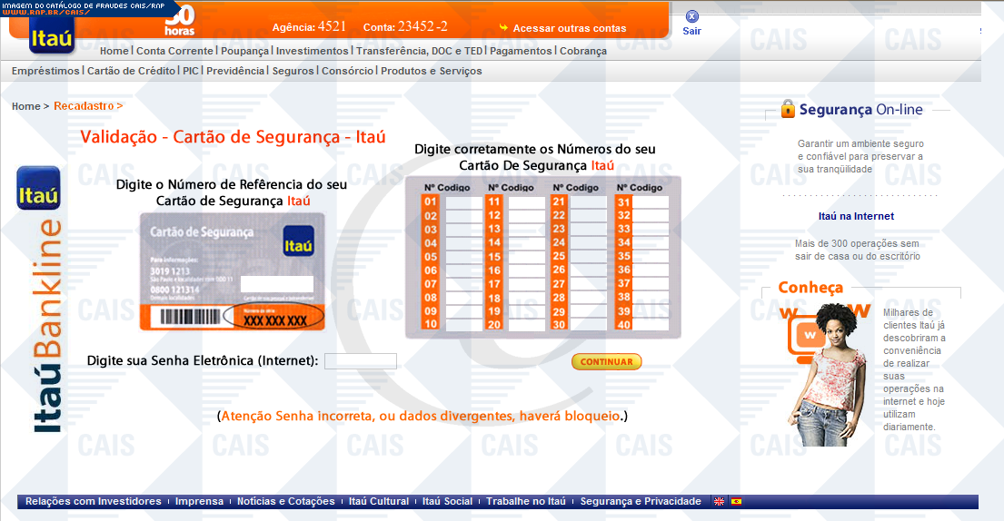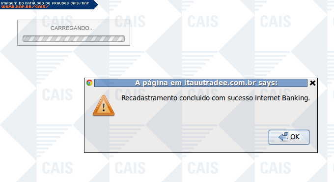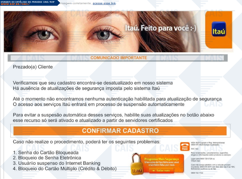 | comentário | Mensagem falsa em nome do banco Itaú informando que a vítima deve confirmar seu cadastro através do link fornecido na mensagem. O link leva a um site falso destinado a coletar dados pessoais da vítima. | |
