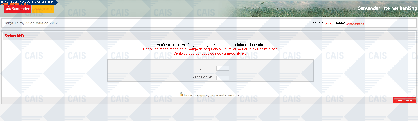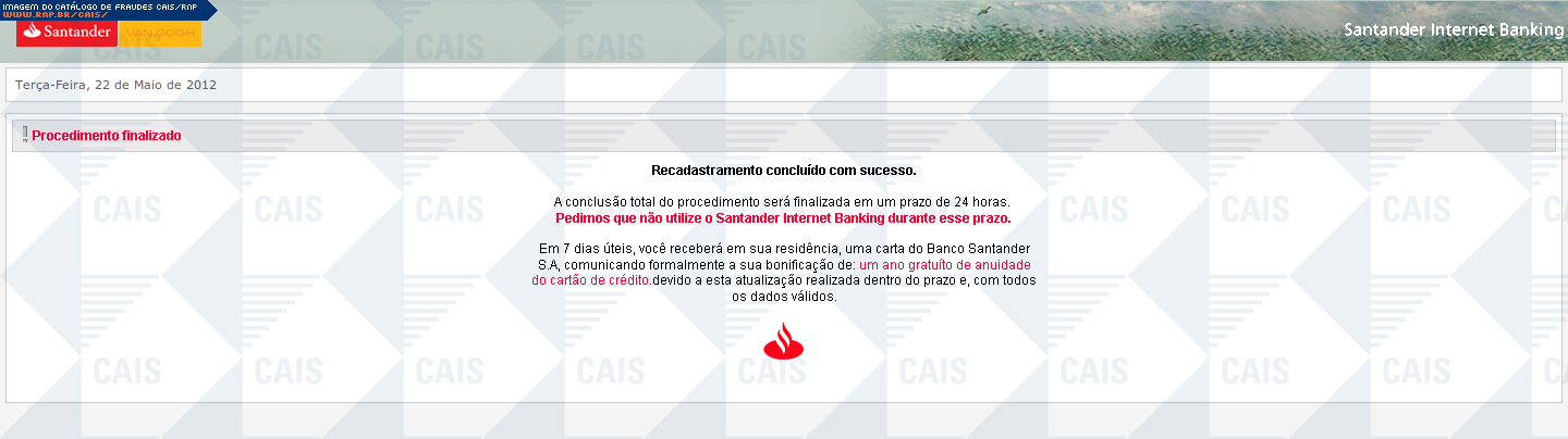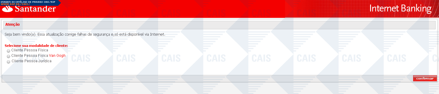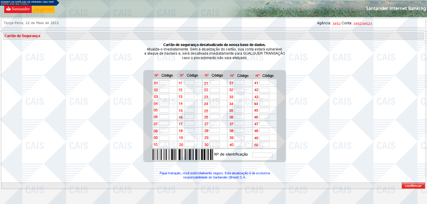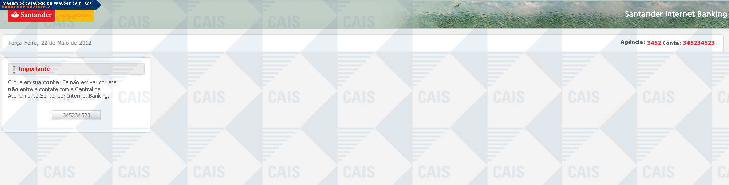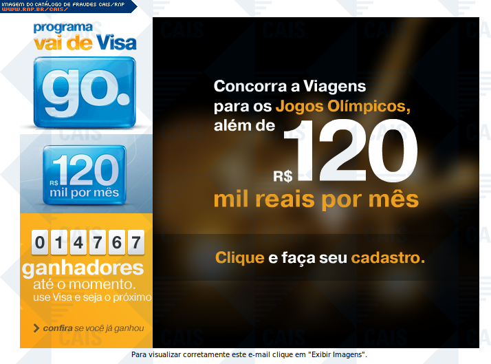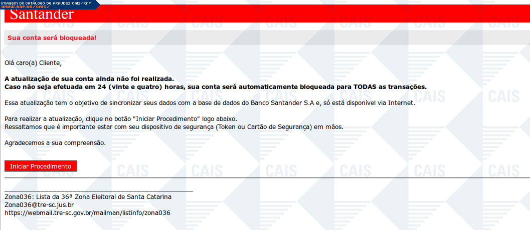 Esta página tem função informativa e educativa. Exibe uma coleção de imagens de phishing scam (fraudes eletrônicas) ou malware (código malicioso) veiculados por meio de spam (e-mail não-solicitado). Trata-se de conteúdo exemplificativo, não exaustivo, uma vez que não é possível contemplar todos os casos de fraudes existentes. Assim, caso você tenha conhecimento de um exemplar que não esteja aqui presente, isto não significa que não seja válido ou real. Inclusive incentivamos que você o envie para análise do CAIS para que, se for o caso, passe a integrar o nosso acervo.