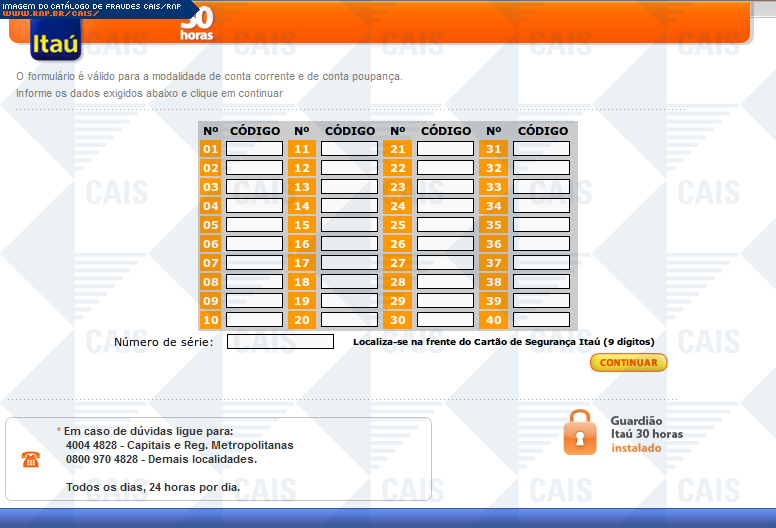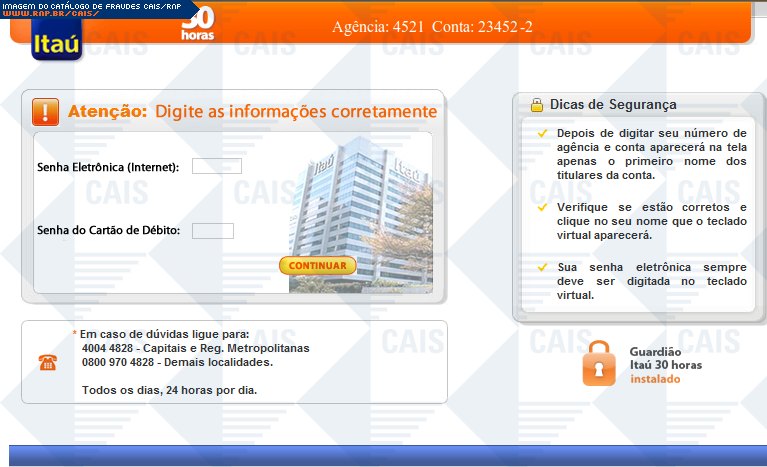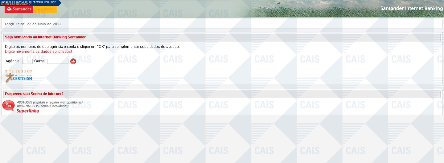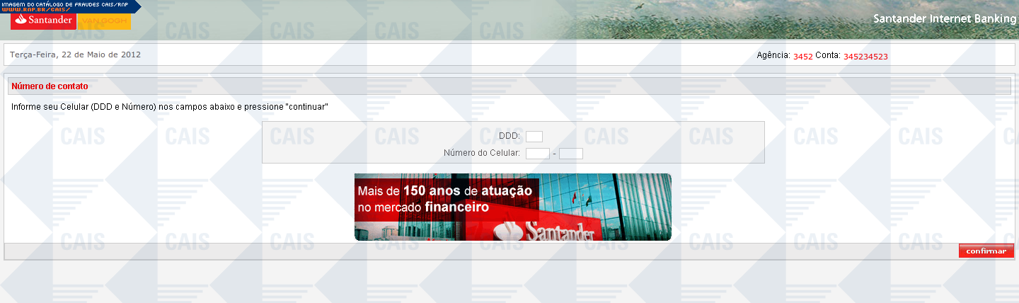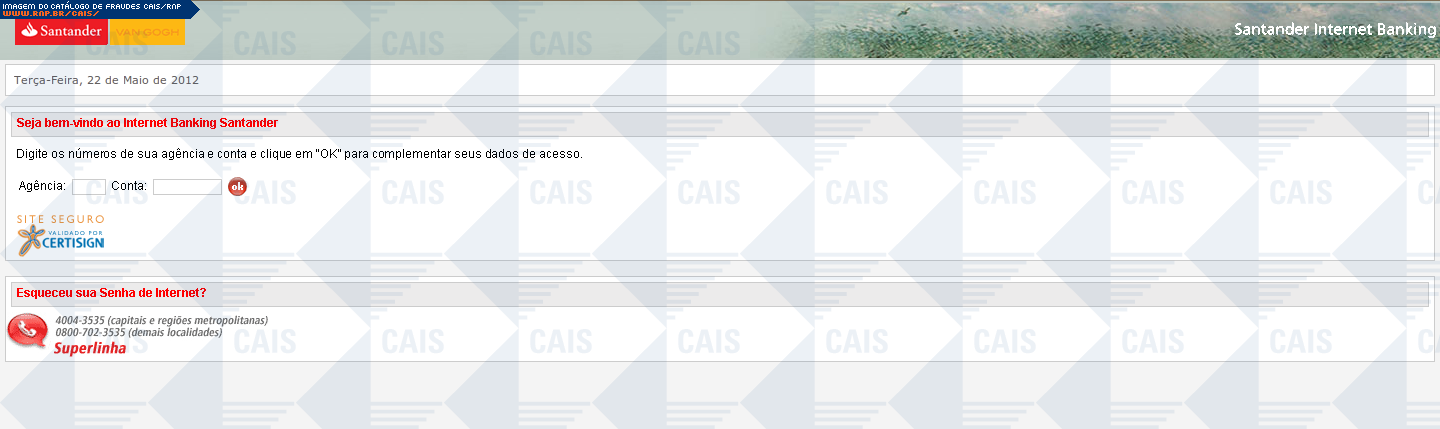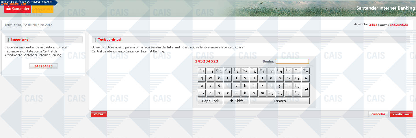 Esta página tem função informativa e educativa. Exibe uma coleção de imagens de phishing scam (fraudes eletrônicas) ou malware (código malicioso) veiculados por meio de spam (e-mail não-solicitado). Trata-se de conteúdo exemplificativo, não exaustivo, uma vez que não é possível contemplar todos os casos de fraudes existentes. Assim, caso você tenha conhecimento de um exemplar que não esteja aqui presente, isto não significa que não seja válido ou real. Inclusive incentivamos que você o envie para análise do CAIS para que, se for o caso, passe a integrar o nosso acervo.