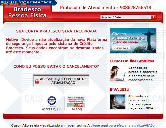 | comentário | Comunicado falso em nome do banco Bradesco com um link para uma suposta atualização de segurança. O link leva a um site falso que tenta aliciar a vítima a fornecer seus dados pessoais. | |