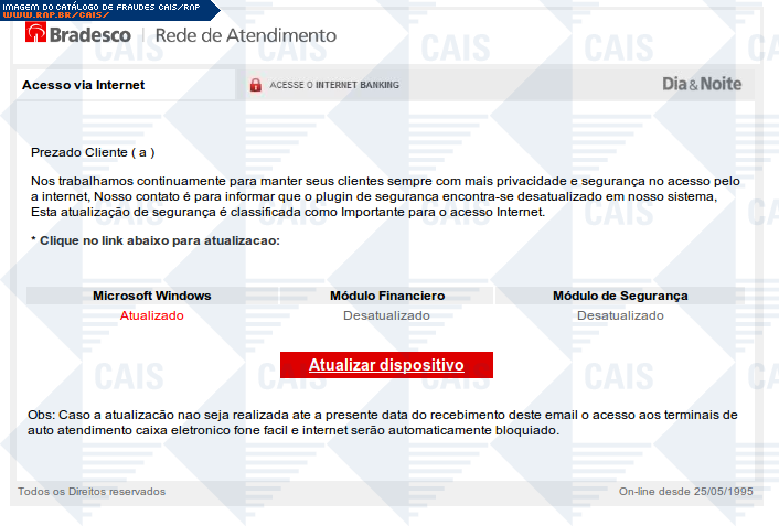 | comentário | A fraude contém um link para a suposta atualização de um plugin de segurança. O link leva a um site falso que tenta aliciar a vítima a fornecer dados de sua conta bancária. | |