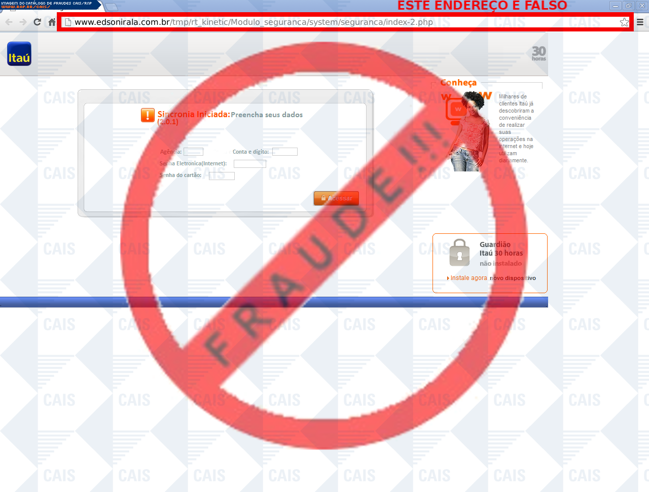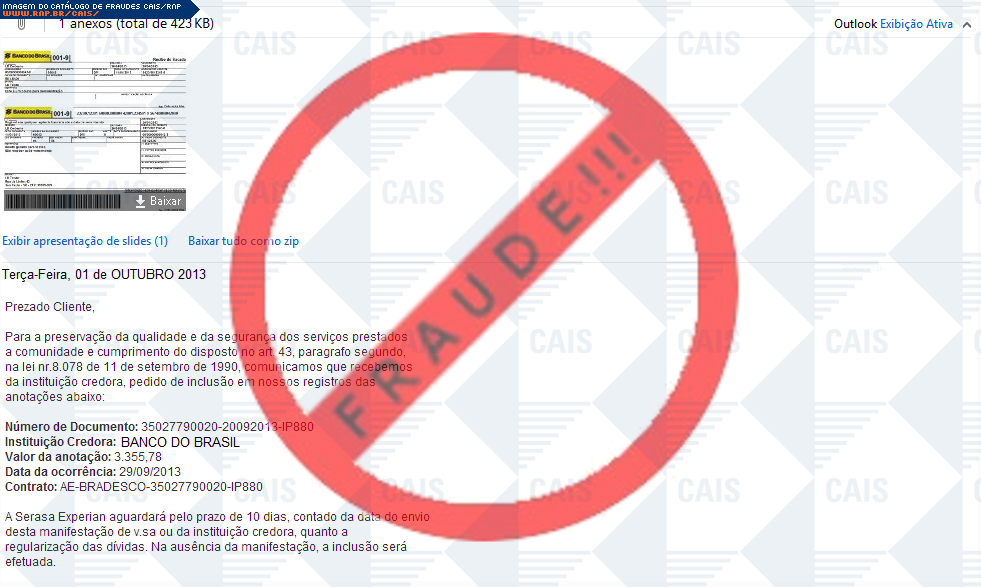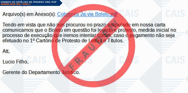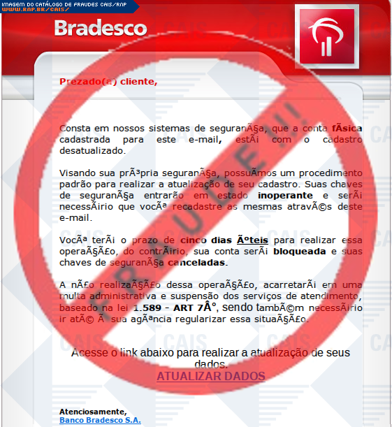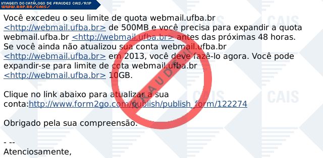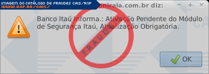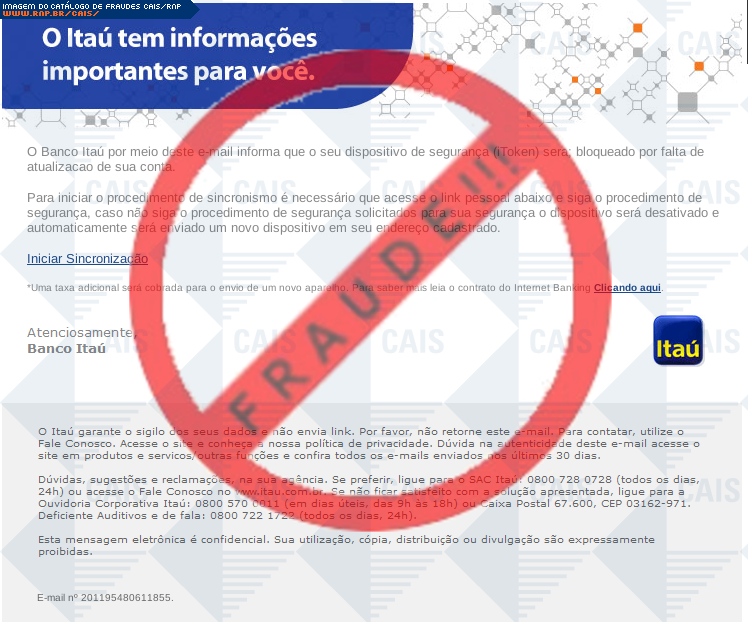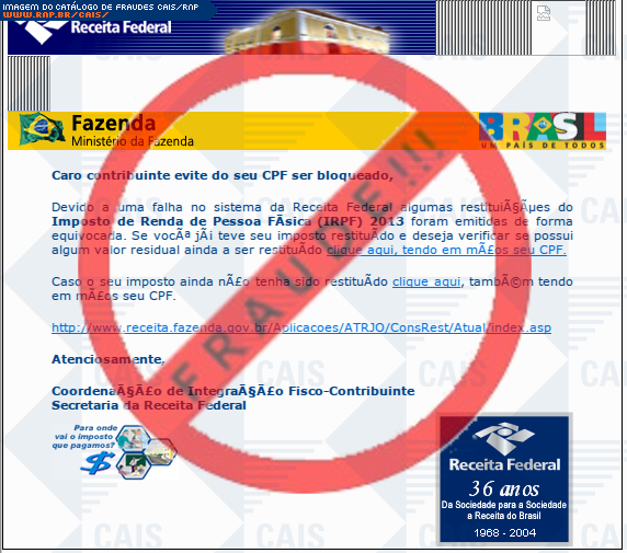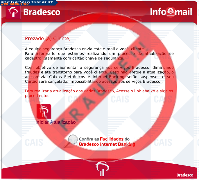 Esta página tem função informativa e educativa. Exibe uma coleção de imagens de phishing scam (fraudes eletrônicas) ou malware (código malicioso) veiculados por meio de spam (e-mail não-solicitado). Trata-se de conteúdo exemplificativo, não exaustivo, uma vez que não é possível contemplar todos os casos de fraudes existentes. Assim, caso você tenha conhecimento de um exemplar que não esteja aqui presente, isto não significa que não seja válido ou real. Inclusive incentivamos que você o envie para análise do CAIS para que, se for o caso, passe a integrar o nosso acervo.