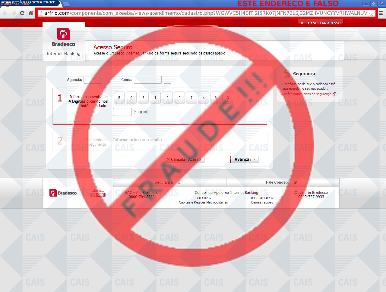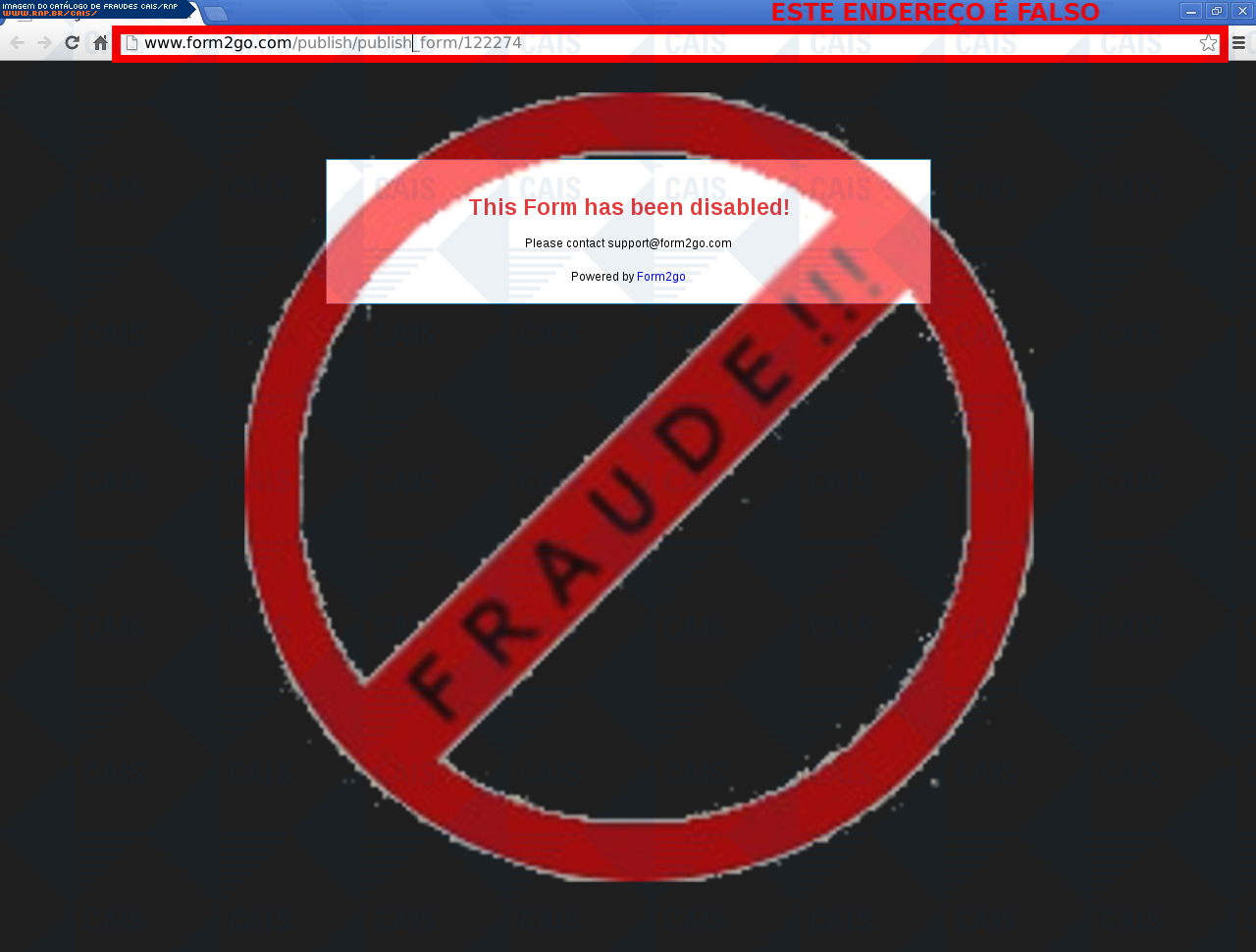 |   |  Fraudes identificadas e divulgadas pelo CAISA partir de 2008, todas as fraudes identificadas pelo CAIS estão sendo ordenadas de acordo com a data de distribuição e disponibilizadas para consulta, com o intuito de conscientizar a comunidade sobre os principais golpes que estão em circulação. Adicionalmente, o CAIS envia alertas de segurança através da lista CAIS Alerta quando uma fraude mostra-se particularmente perigosa aos usuários de computadores. Reporte fraudes: