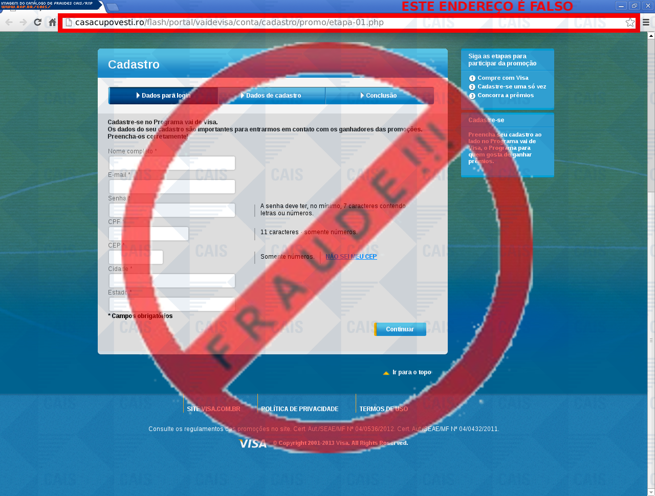 | comentário | Uma mensagem é enviada contendo um informativo de promoção, mas ao acessar o link de cadastro o usuário é levado a um site falso que solicita dados de cartões de credito. | |