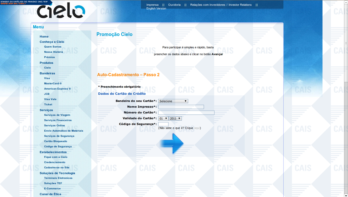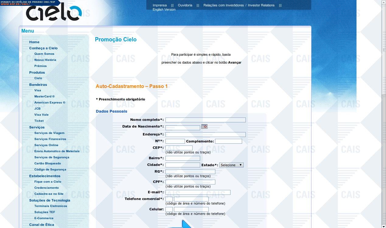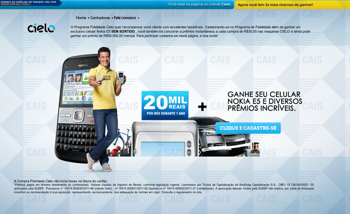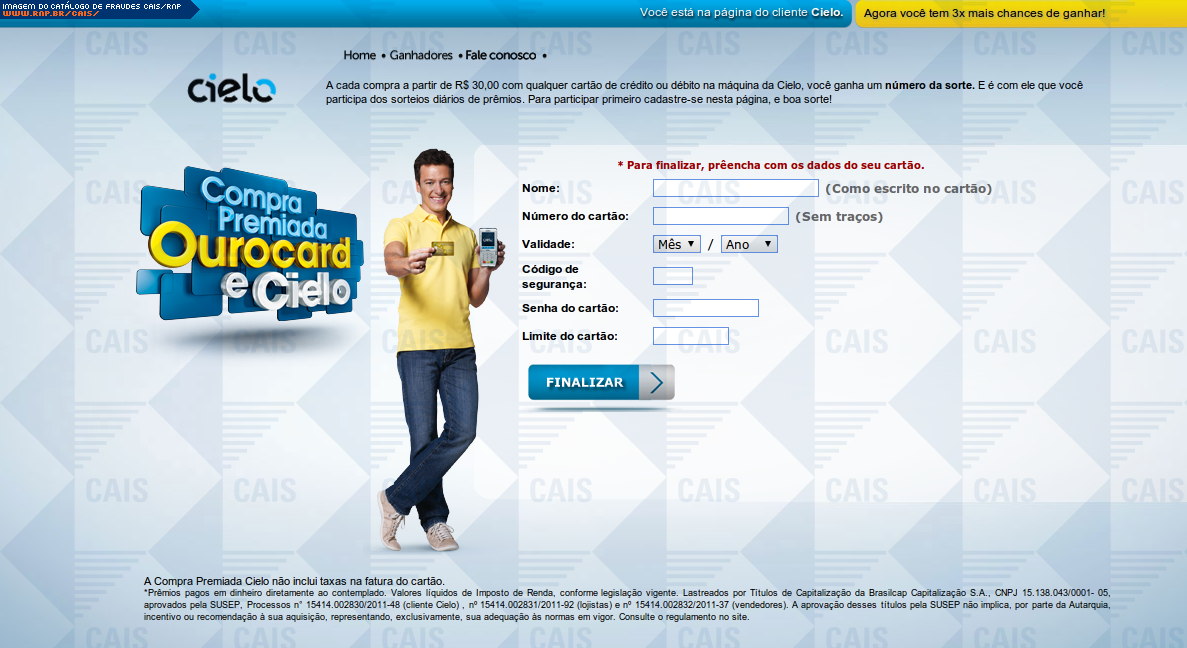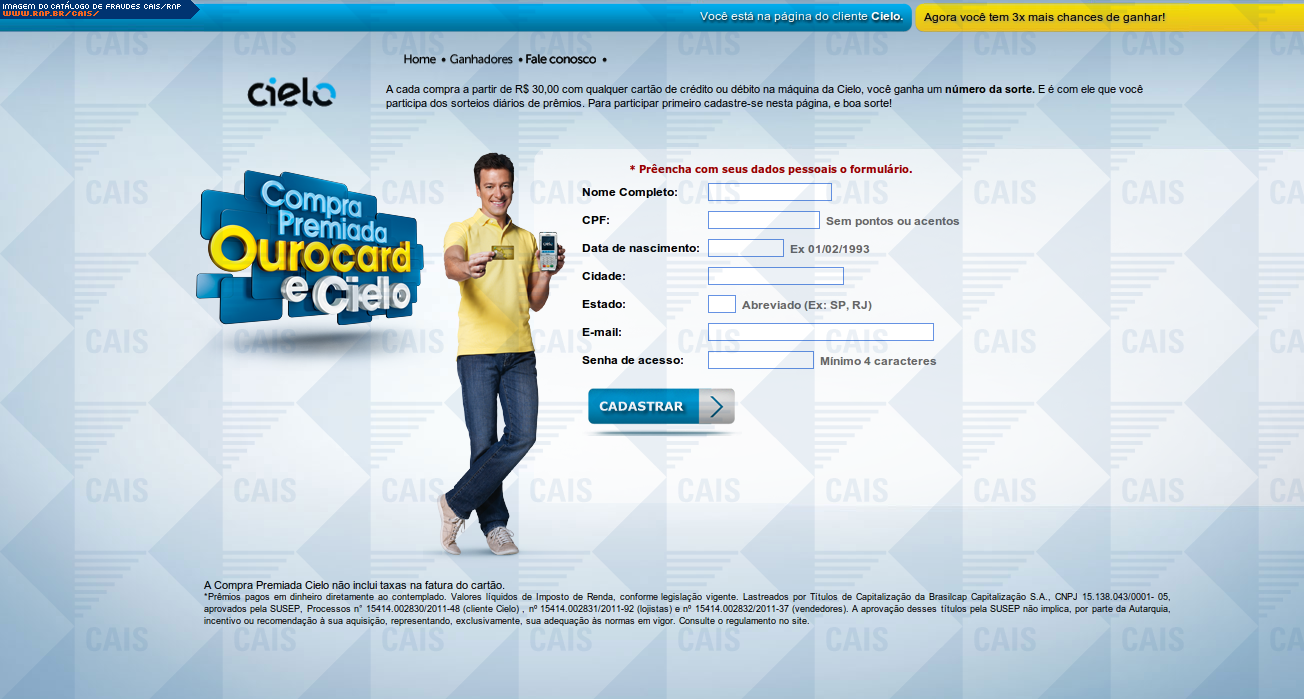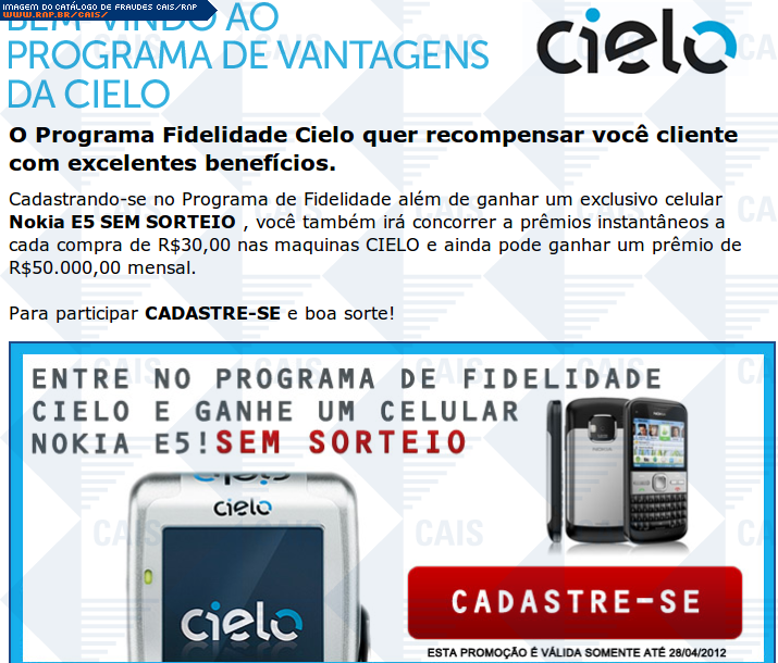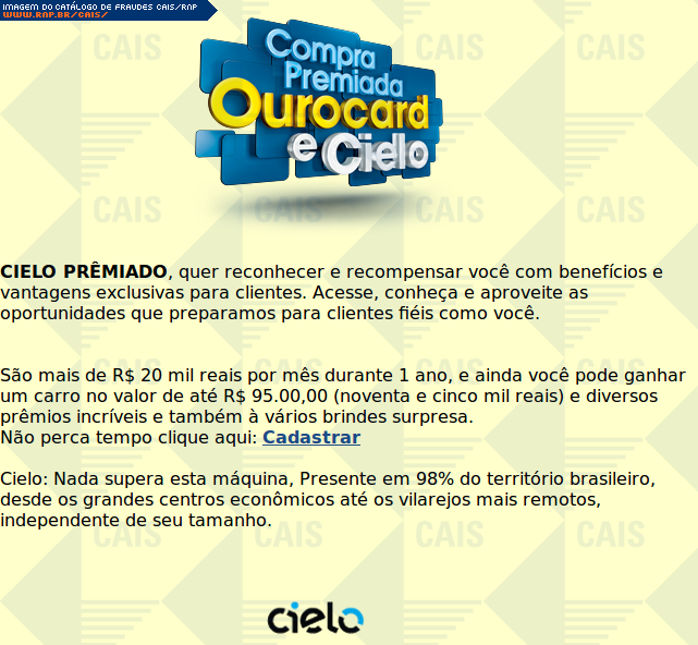 | comentário | A fraude tenta aliciar a vítima a se cadastrar em uma promoção da Cielo através de um página falsa. | |