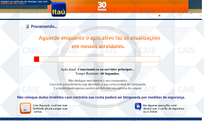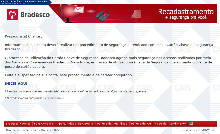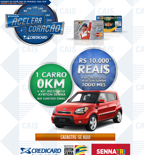 Esta página tem função informativa e educativa. Exibe uma coleção de imagens de phishing scam (fraudes eletrônicas) ou malware (código malicioso) veiculados por meio de spam (e-mail não-solicitado). Trata-se de conteúdo exemplificativo, não exaustivo, uma vez que não é possível contemplar todos os casos de fraudes existentes. Assim, caso você tenha conhecimento de um exemplar que não esteja aqui presente, isto não significa que não seja válido ou real. Inclusive incentivamos que você o envie para análise do CAIS para que, se for o caso, passe a integrar o nosso acervo.