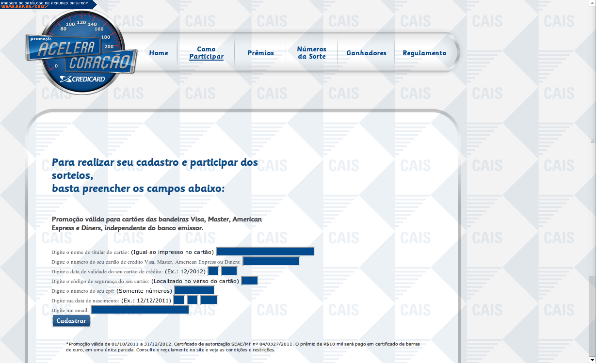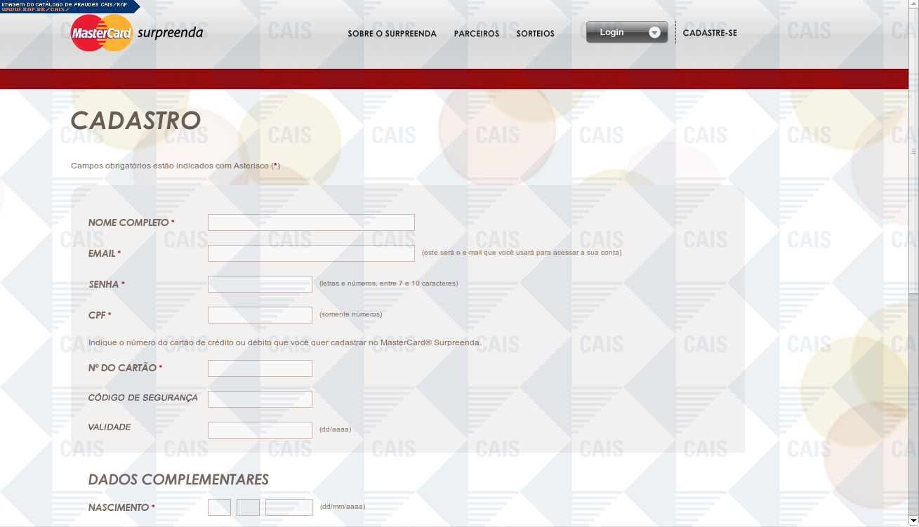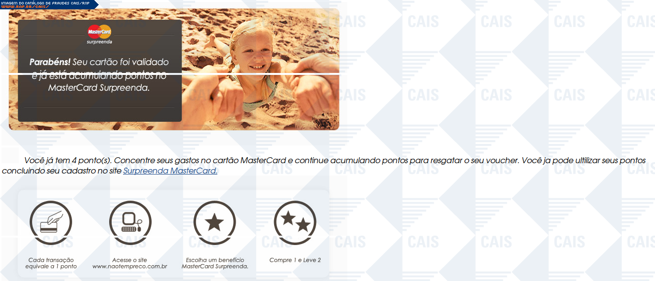 | comentário | A fraude contém um link para o cadastro em uma promoção da Mastercard. A página falsa tenta aliciar a vítima a fornecer seus dados pessoais. | |
