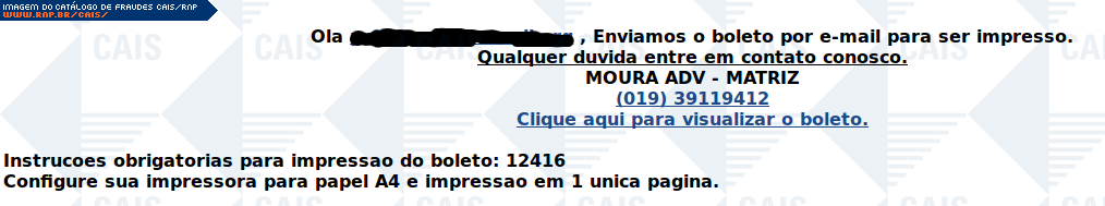 | comentário | Mensagem em nome de Advocacia Moura disponibiliza um suposto boleto para download. Tal boleto, contudo leva ao download de um malware identificado como: Trojan.Win32.VBInject.gen (v) (VIPRE). | |