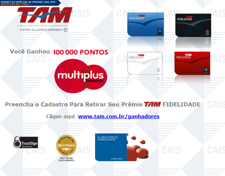 | comentário | Mensagem falsa informando que a vítima recebeu um prêmio na promoção TAM Fidelidade. O link para o resgate do prêmio leva a conteúdo malicioso que não estava disponível no momento da análise. | |