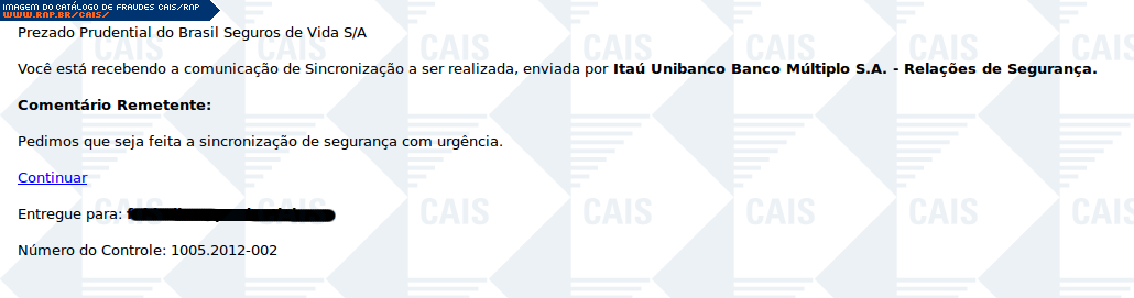| comentário | A fraude tenta aliciar a vítima realizar uma suposta sincronização de segurança através de um link para um site falso. | |