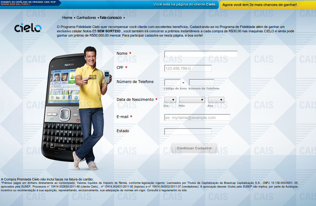 | comentário | A fraude informa que a vítima foi selecionada para ganhar um celular Nokia bastando apenas se cadastrar através do link. O link leva a um site falso destinado a coletar dados pessoais da vítima. | |