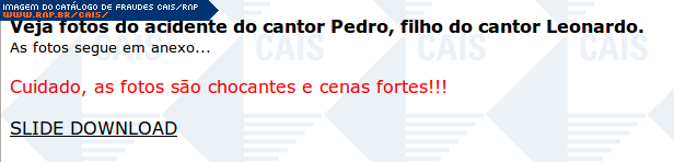 | comentário | A fraude contém um link para o download de supostas fotos do acidente do cantor Pedro. O conteúdo malicioso não estava disponível no momento da análise. | |