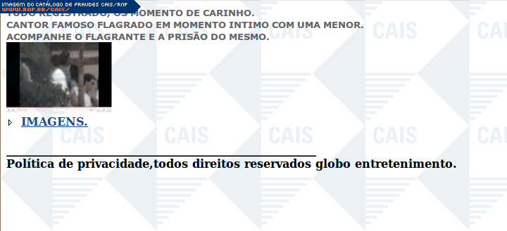| comentário | A mensagem contém um link para um suposto vídeo em que um cantor famoso foi flagrado se relacionando com uma menor de idade. A imagem do vídeo, quando clicada, leva a um arquivo malicioso que foi identificado como | |