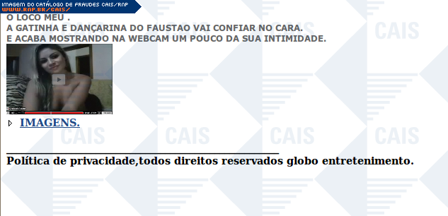 | comentário | A mensagem contém o link para um suposto vídeo de uma dançarina do Faustão. O link leva ao malware Gen:Trojan.Heur.kv0@rfhEH5oGu (BitDefender). | |