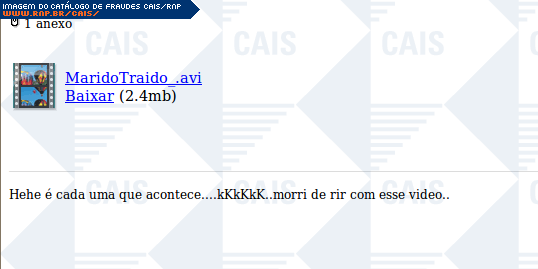| comentário | A mensagem contém um link para um suposto vídeo de uma mulher com seu amante que teria sido colocado na internet pelo marido. O link leva a um arquivo malicioso identificado como UDS:DangerousObject.Multi.Generic (Kaspersky). | |