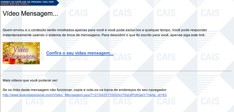 | comentário | A fraude se passa por um vídeo mensagem, que teria sido enviado por amigo da vítima. O link para o vídeo leva a conteúdo malicioso que não estava disponível no momento da análise. | |