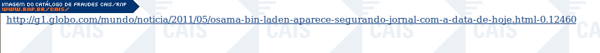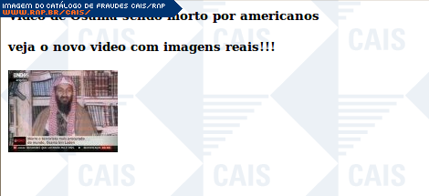 | comentário | A mensagem contém um link para um suposto vídeo em que Osama Bin Laden segura um jornal com data posterior ao anúncio de sua morte. O link leva a um software malicioso que foi identificado como Gen:Variant.Downloader.91 (BitDefender). | |