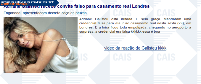 | comentário | A fraude se passa por uma notícia do site oFuxico sobre a lua de mel de Willian e Kate. A mensagem contém um link para um suposto vídeo com cenas picantes do casal em um barco. O link leva a um arquivo malicioso que foi identificado como Gen:Trojan.Heur.DP.mOWbaCNilrkG... (leia mais) | |