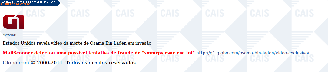 | comentário | A mensagem, que teria sido enviada pelo portal g1, contém um link para o vídeo com a morte de Osama. O vídeo teria sido divulgado pelo governo dos EUA. O conteúdo malicioso não estava disponível no momento da análise. | |
