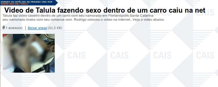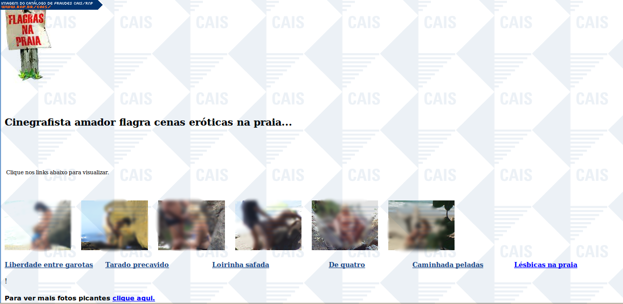 | comentário | Mensagem contendo links cenas de sexo na praia, que teriam sido flagradas por um cinegrafista amador. O conteúdo malicioso não estava disponível no momento da análise. | |