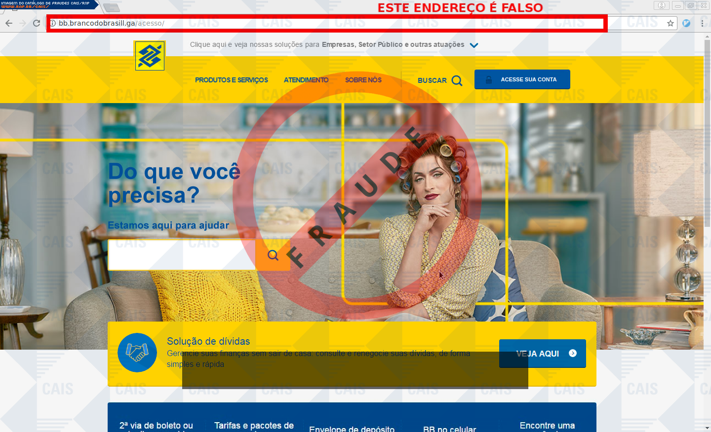 Esta página tem função informativa e educativa. Exibe uma coleção de imagens de phishing scam (fraudes eletrônicas) ou malware (código malicioso) veiculados por meio de spam (e-mail não-solicitado). Trata-se de conteúdo exemplificativo, não exaustivo, uma vez que não é possível contemplar todos os casos de fraudes existentes. Assim, caso você tenha conhecimento de um exemplar que não esteja aqui presente, isto não significa que não seja válido ou real. Inclusive incentivamos que você o envie para análise do CAIS para que, se for o caso, passe a integrar o nosso acervo.