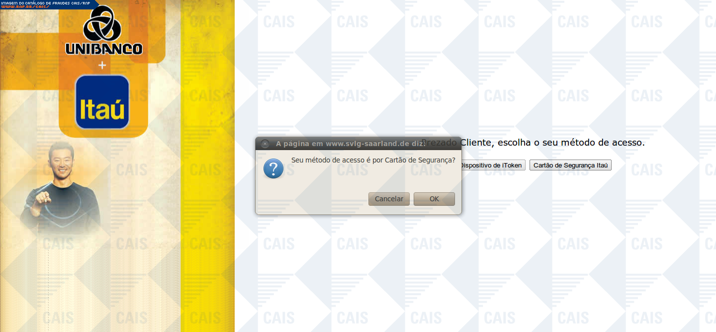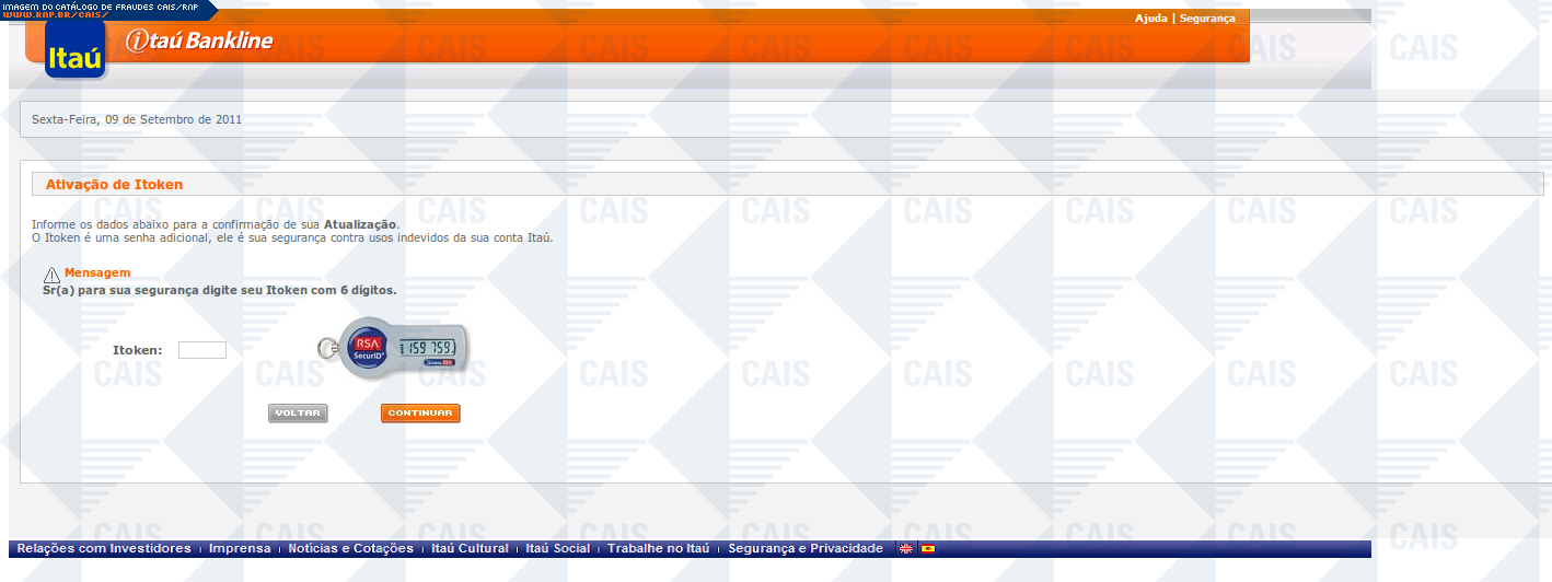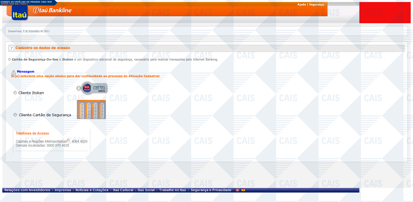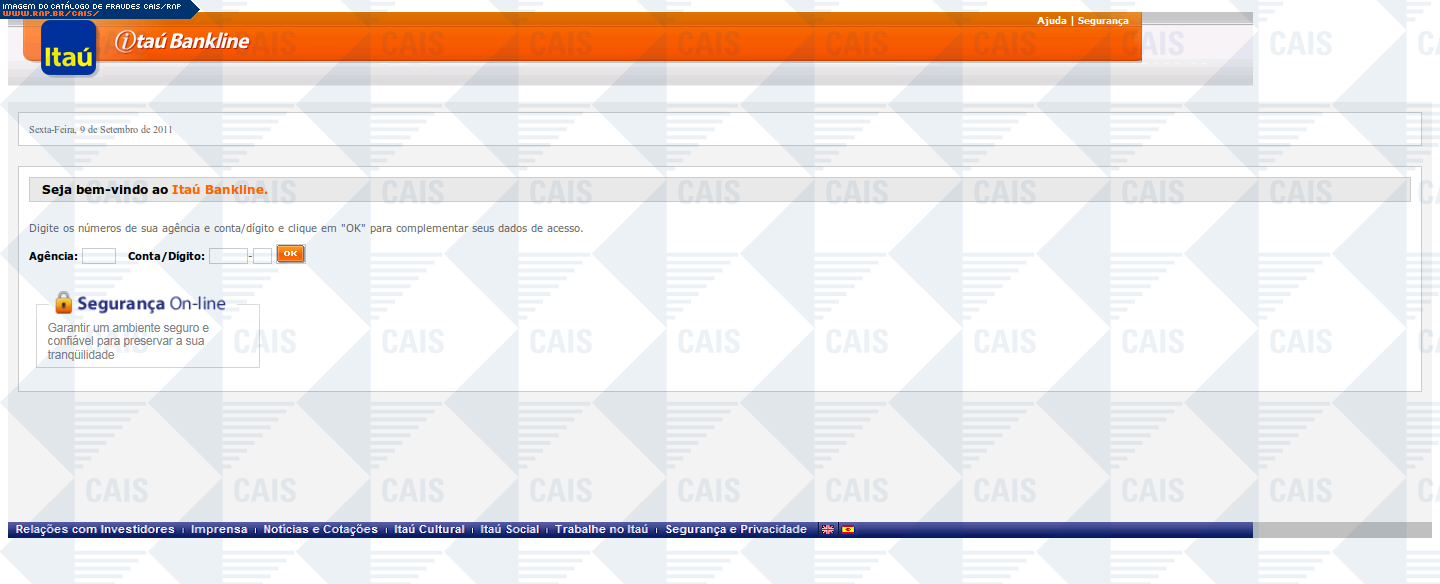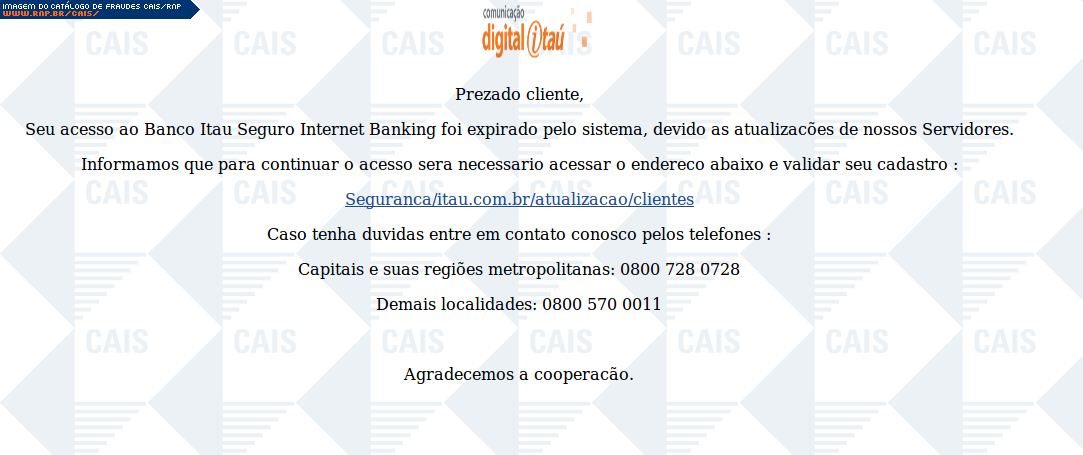 | comentário | A mensagem informa que a vítima teve seu acesso ao Itaú Seguro Internet Banking expirado. O link para o suposto recadastramento leva a uma página falsa, destinada a coletar dados pessoais da vítima. | |