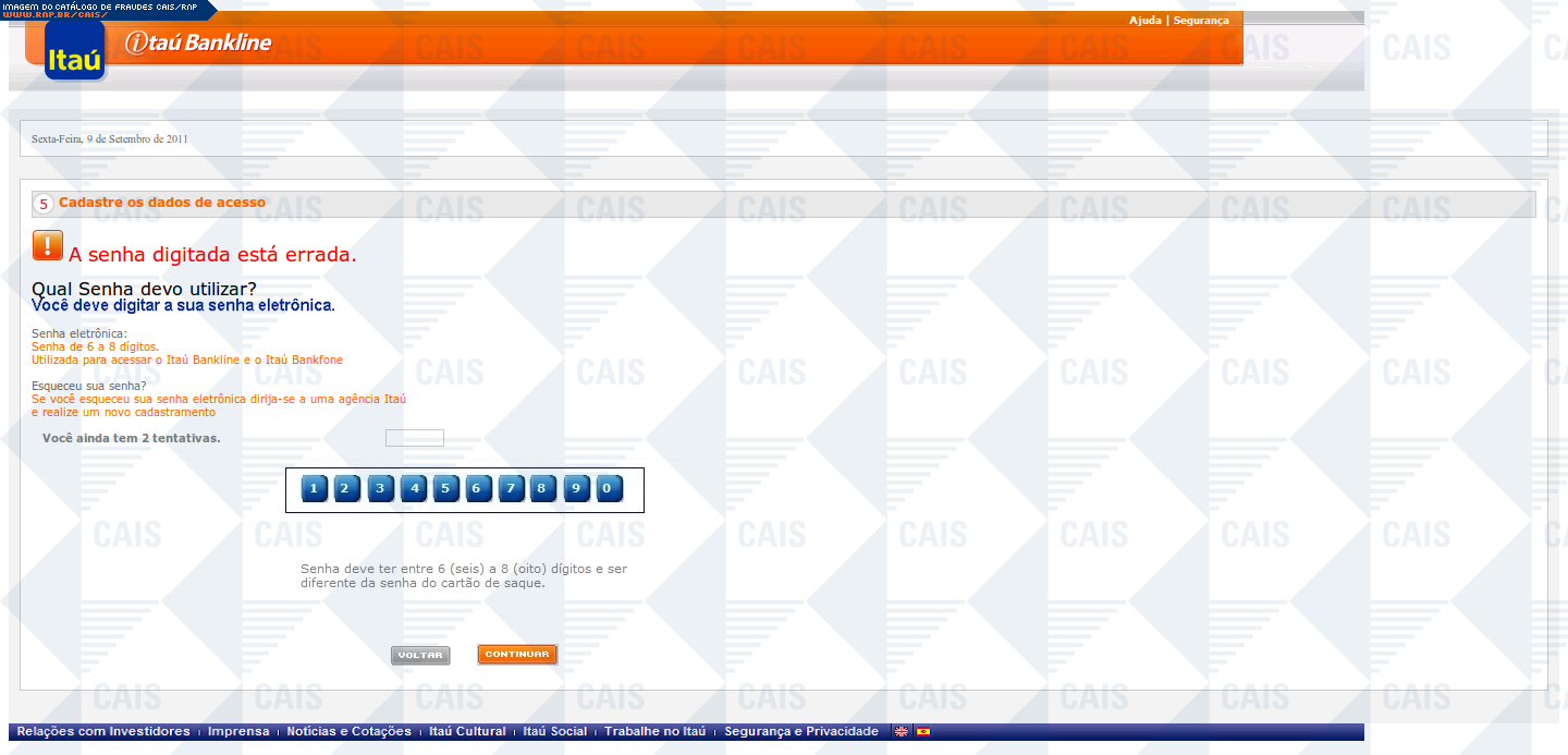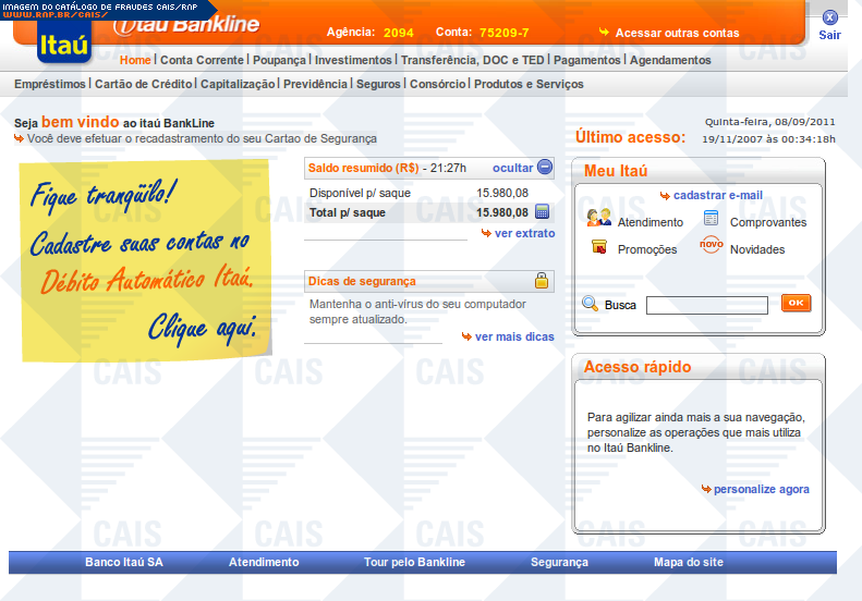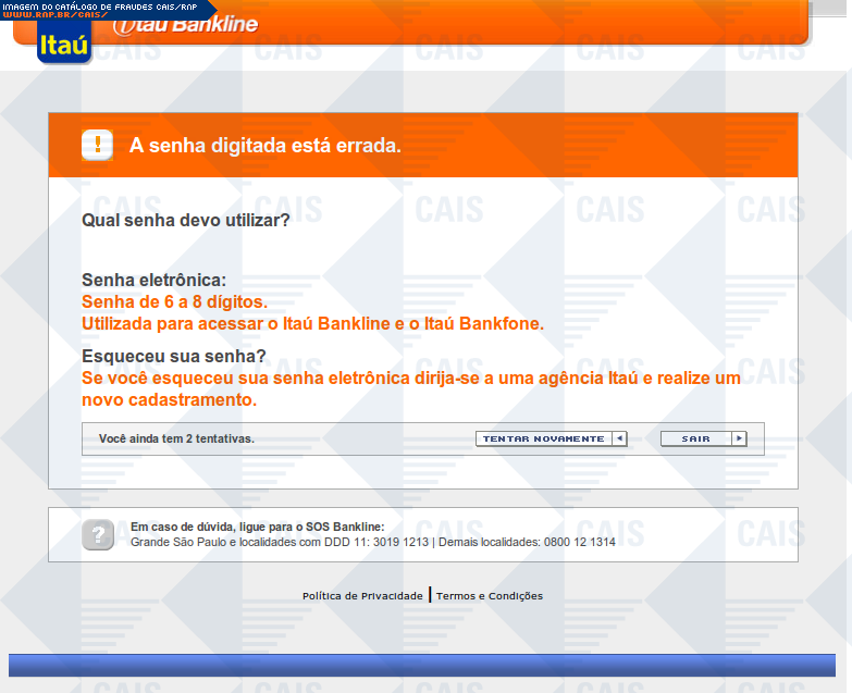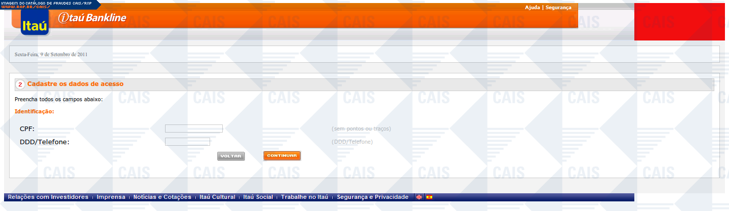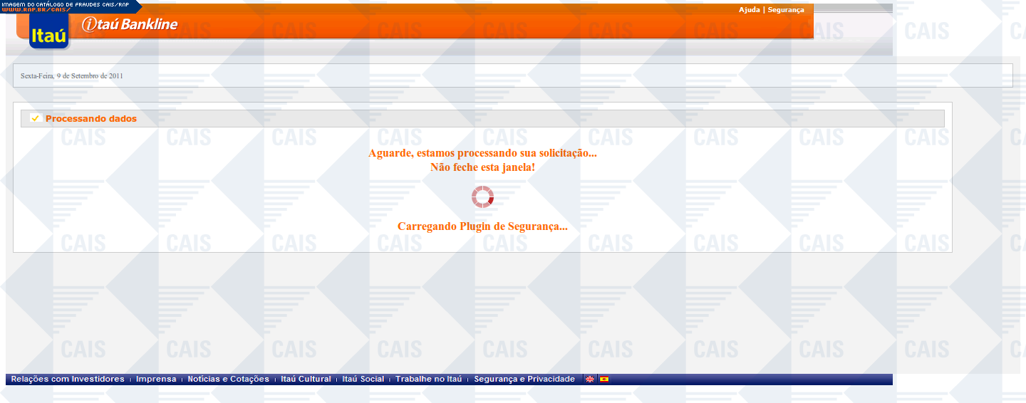 | comentário | A mensagem informa que a vítima teve seu acesso ao Itaú Seguro Internet Banking expirado. O link para o suposto recadastramento leva a uma página falsa, destinada a coletar dados pessoais da vítima. | |
