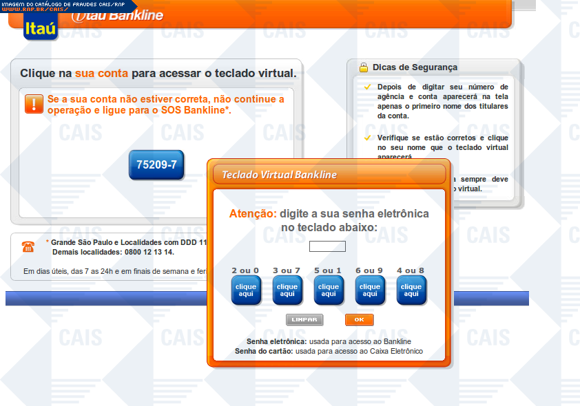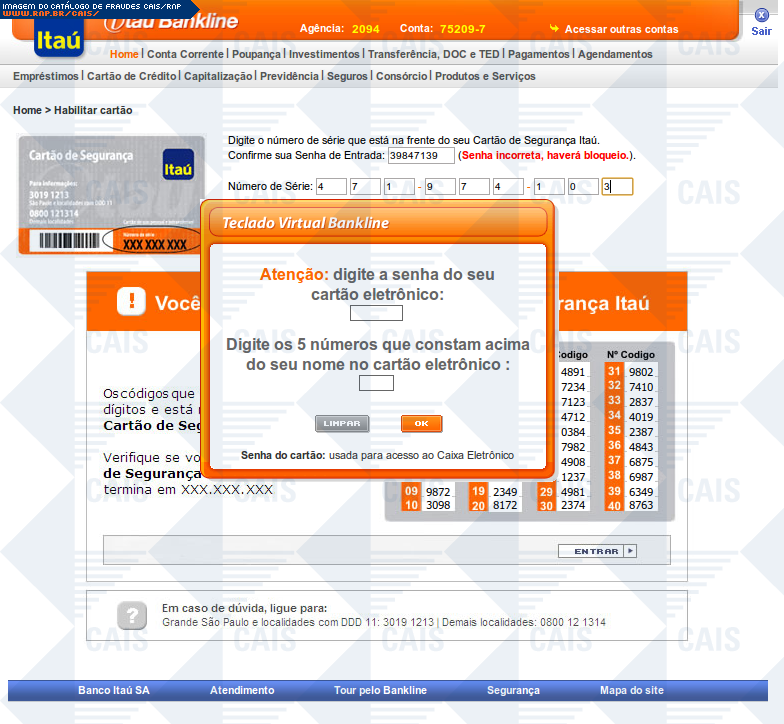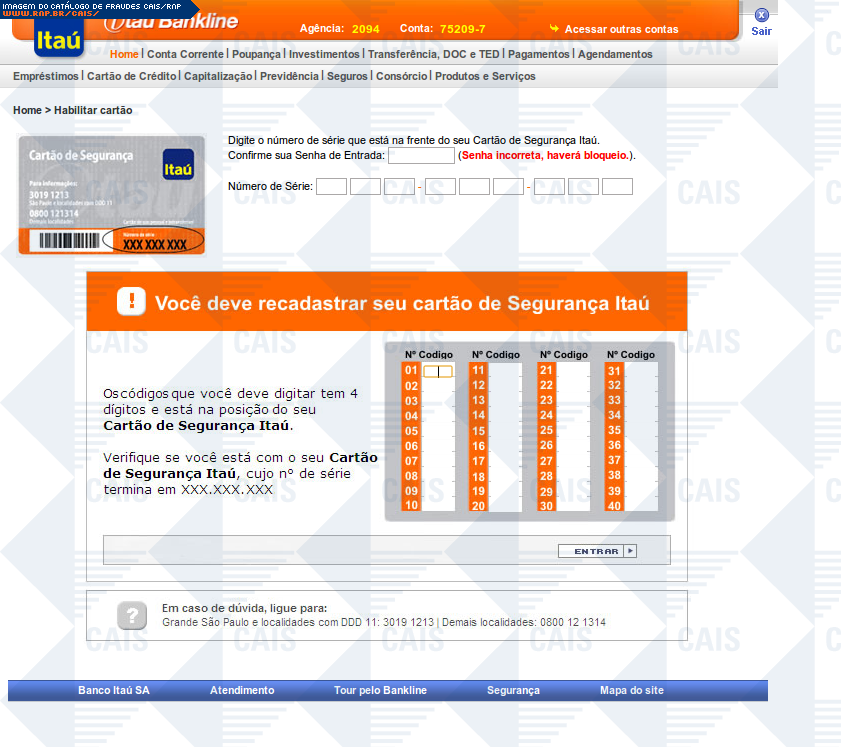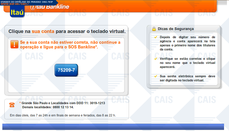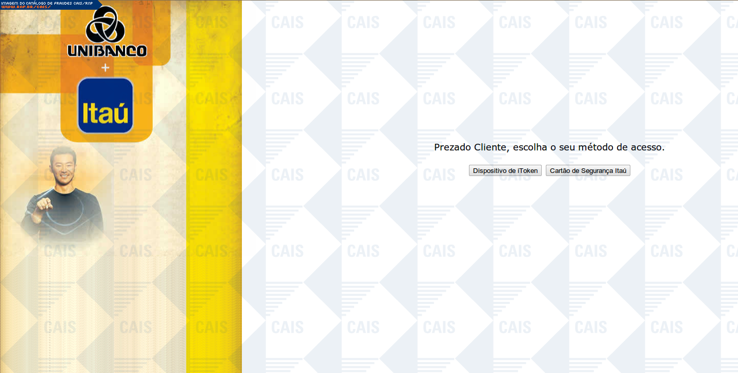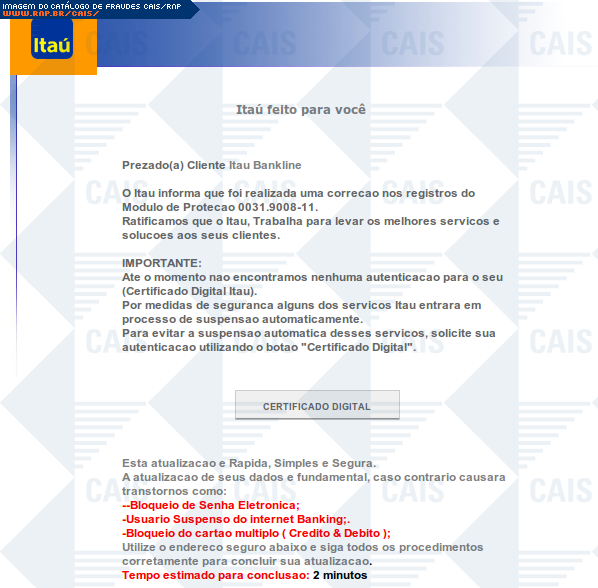 | comentário | A mensagem, em nome do banco Itaú, informa que a vítima deve realizar a correção nos registros do módulo de proteção. A fraude contém um link que leva a uma página falsa, destinada a coletar dados da conta bancária da vítima. | |