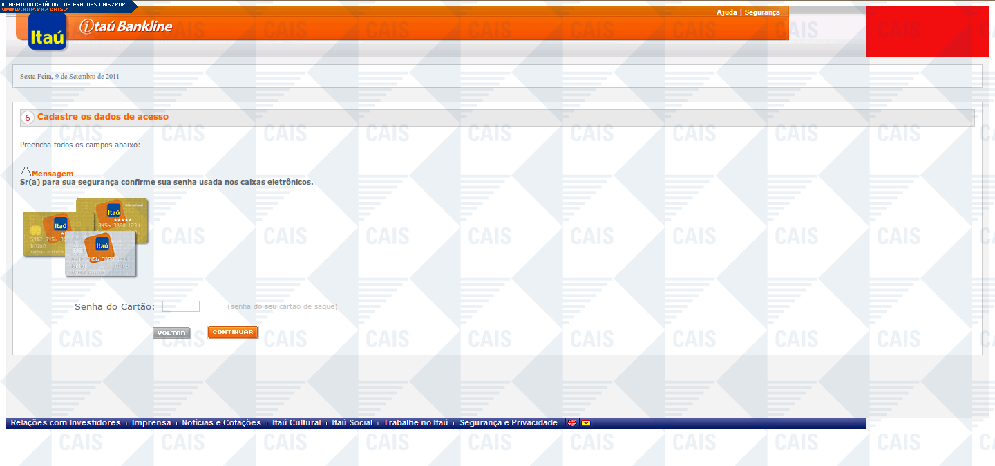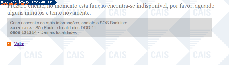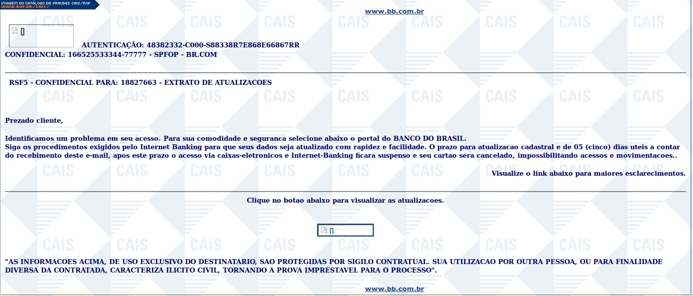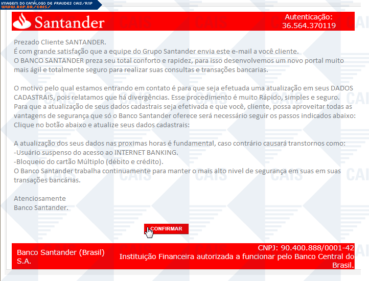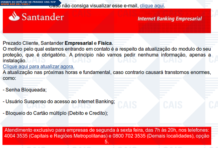 Esta página tem função informativa e educativa. Exibe uma coleção de imagens de phishing scam (fraudes eletrônicas) ou malware (código malicioso) veiculados por meio de spam (e-mail não-solicitado). Trata-se de conteúdo exemplificativo, não exaustivo, uma vez que não é possível contemplar todos os casos de fraudes existentes. Assim, caso você tenha conhecimento de um exemplar que não esteja aqui presente, isto não significa que não seja válido ou real. Inclusive incentivamos que você o envie para análise do CAIS para que, se for o caso, passe a integrar o nosso acervo.