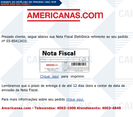 | comentário | A mensagem, em nome das Lojas Americanas, se passa pelo envio de uma nota fiscal eletrônica. O conteúdo malicioso já havia sido removido no momento da análise. | |