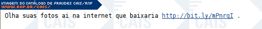 | comentário | A mensagem contém um link para supostas fotos da vítima, que estariam sendo divulgadas na internet. O link leva a conteúdo malicioso que não estava mais disponível no momento da análise. | |